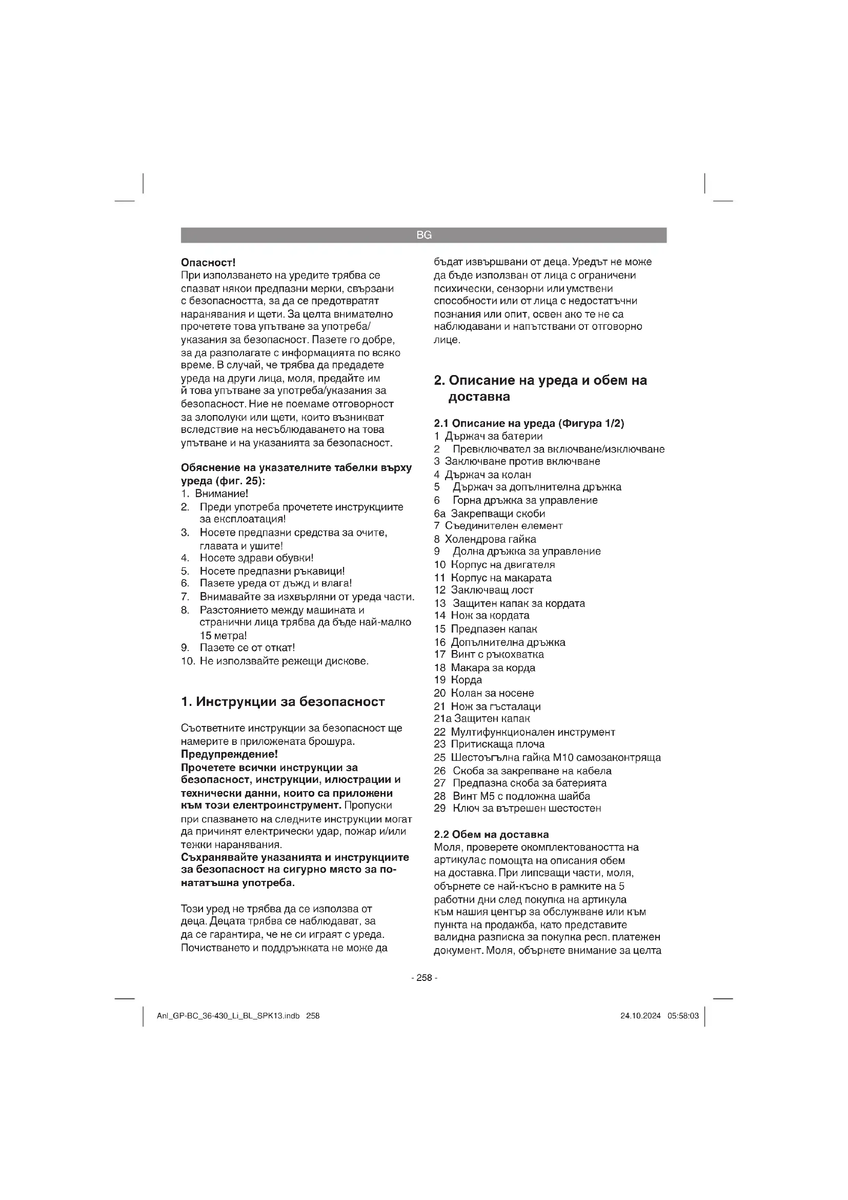 с помощта на описания обем на доставка. При липсващи части, моля, обърнете се най-късно в рамките на 5 работни дни след покупка на артикула към нашия център за обслужване или към пункта на продажба, като представите валидна разписка за покупка респ. платежен документ. Моля, обърнете внимание за целта Anl_GP-BC_36-430_Li_BL_SPK13.indb 258Anl_GP-BC_36-430_Li_BL_SPK13.indb 258 24.10.2024 05:58:0324.10.2024 05:58:03BG