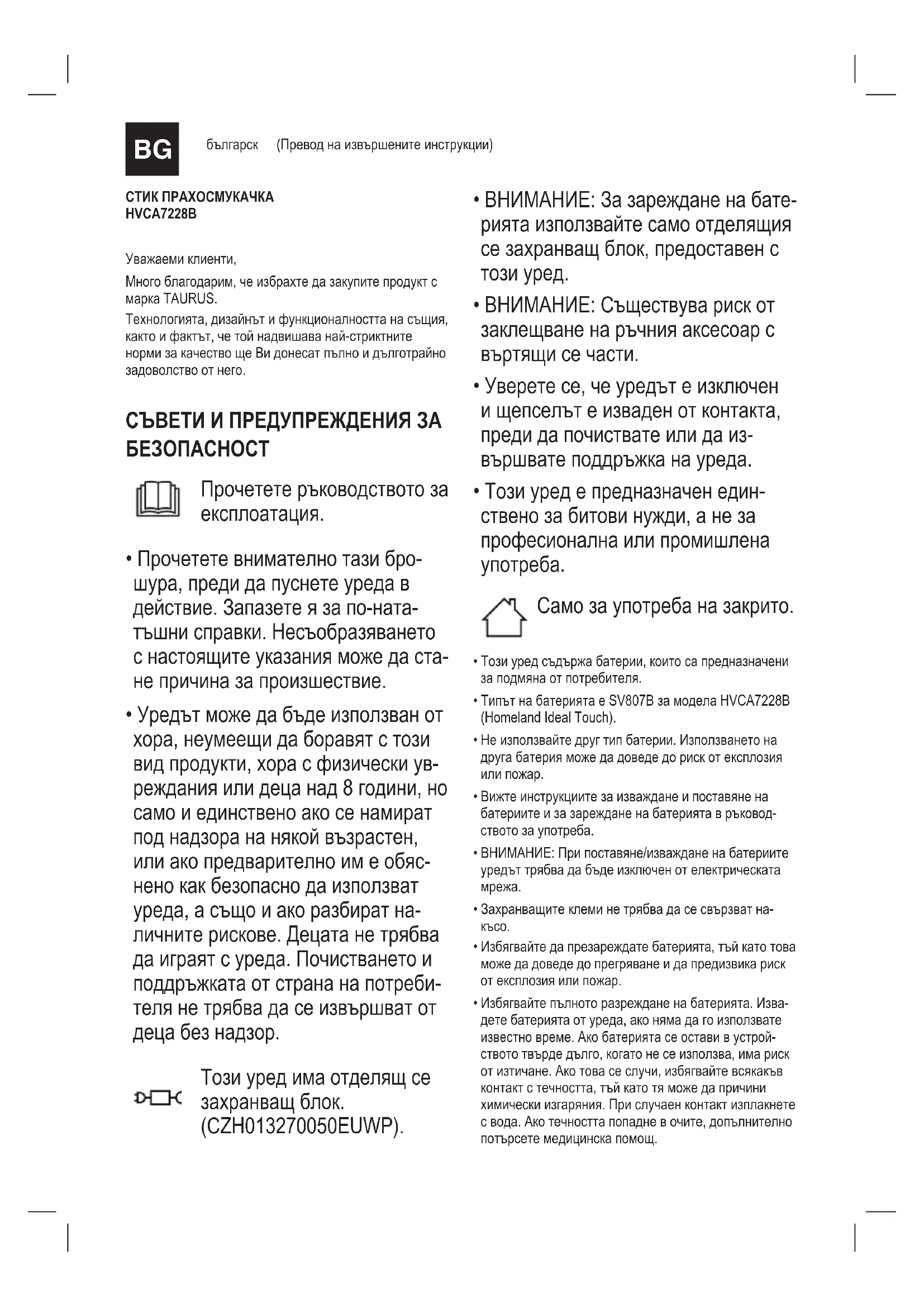СТИК ПРАХОСМУКАЧКА HVCA7228B Уважаеми клиенти, Много благодарим, че избрахте да закупите продукт с марка TAURUS. Технологията, дизайнът и функционалността на същия, както и фактът, че той надвишава най-стриктните норми за качество ще Ви донесат пълно и дълготрайно задоволство от него. СЪВЕТИ И ПРЕДУПРЕЖДЕНИЯ ЗА БЕЗОПАСНОСТ Прочетете ръководството за експлоатация.