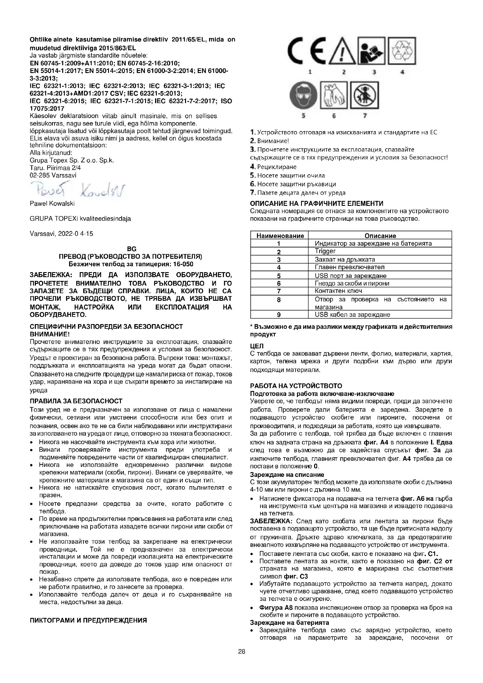 Продукт: Телбод за тапицерии Модел: 16-050 Търговско наименование: NEO ИНСТРУМЕНТИ Сериен номер: 00001 ÷ 99999 Тази декларация за съответствие се издава единствено под отговорността на производителя. Описаният по-горе продукт отговаря на следните документи: Директива за машините 2006/42/ЕО Директива за електромагнитната съвместимост 2014/30/ЕС Директива 2011/65/ЕС на RoHS, изменена с Директива 2015/863/ЕС И отговаря на изискванията на следните стандарти: BG 60745-1:2009+A11:2010; EN 60745-2-16:2010; EN 55014-1:2017; EN 55014-:2015; EN 61000-3-2:2014; EN 61000- 3-3:2013; IEC 62321-1:2013; IEC 62321-2:2013; IEC 62321-3-1:2013; IEC 62321-4:2013+AMD1:2017 CSV; IEC 62321-5:2013; IEC 62321-6:2015; IEC 62321-7-1:2015; IEC 62321-7-2:2017; ISO 17075:2017 Тази декларация се отнася само до машината в състоянието, в което е пусната на пазара, и не обхваща компоненти, добавени от крайния потребител или последващите действия, извършени от крайния потребител. Име и адрес на лицето, пребиваващо или установено в ЕС, упълномощено да изготви техническата документация: Подписан от името на: Grupa Топекс Sp. Z o.o. Сп.к. Кошер. Гранична земя 2/4 02-285 Варшава Пауел Ковалски Качествен представител на GRUPA TOPEX Варшава, 2022-0 4-15