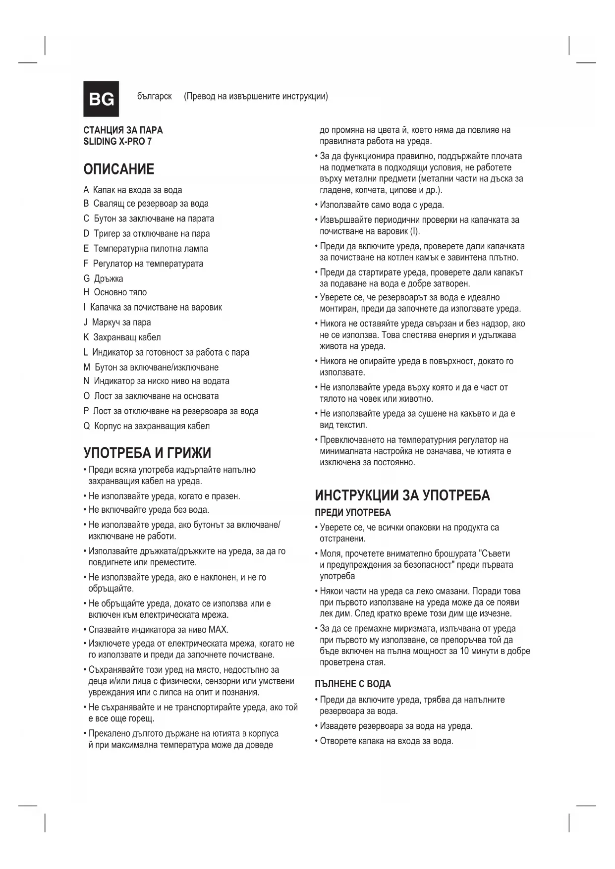 A Капак на входа за вода B Свалящ се резервоар за вода C Бутон за заключване на парата D Тригер за отключване на пара E Температурна пилотна лампа F Регулатор на температурата G Дръжка H Основно тяло I Капачка за почистване на варовик J Маркуч за пара K Захранващ кабел L Индикатор за готовност за работа с пара M Бутон за включване/изключване N Индикатор за ниско ниво на водата O Лост за заключване на основата P Лост за отключване на резервоара за вода Q Корпус на захранващия кабел УПОТРЕБА И ГРИЖИ