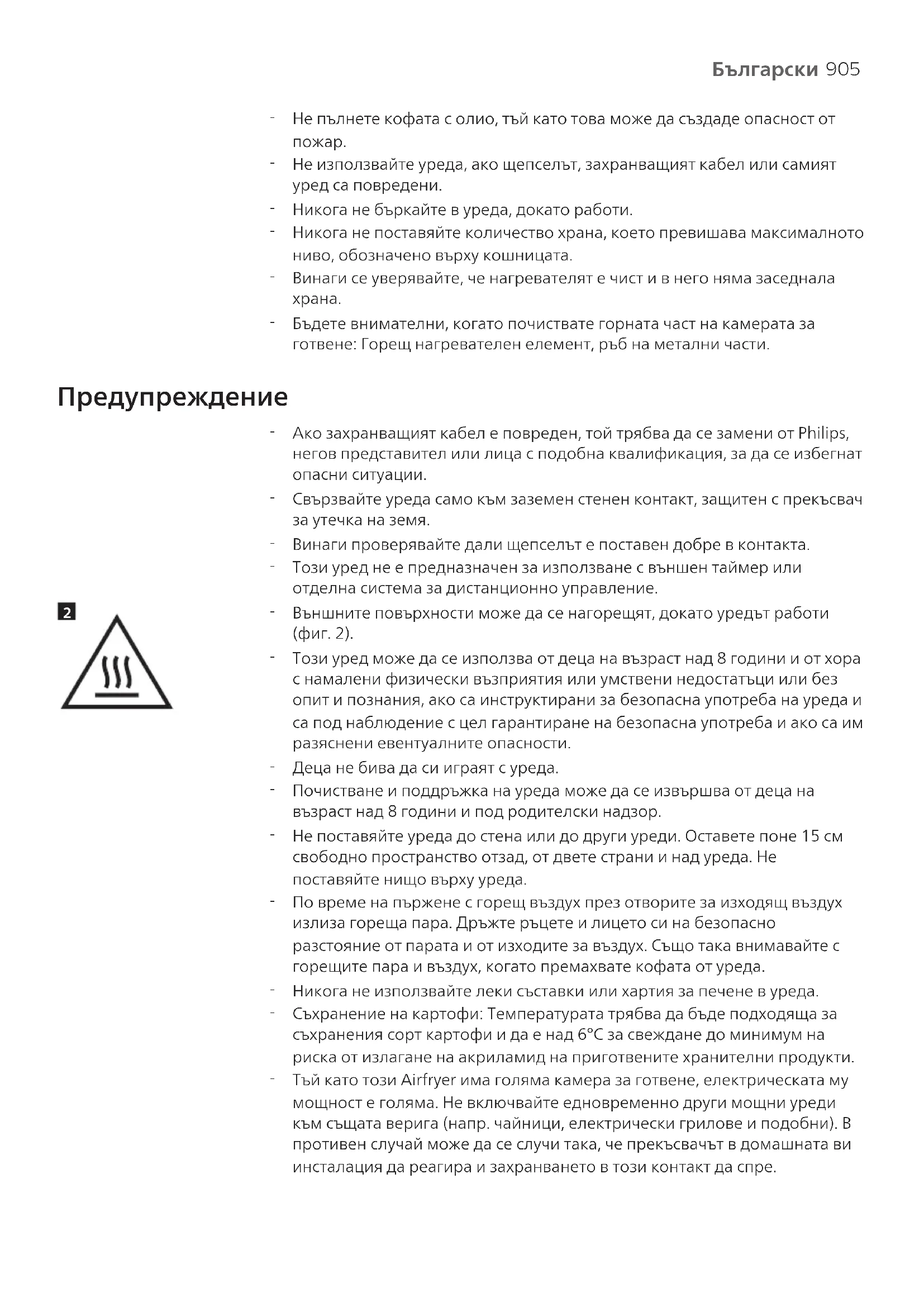 Тъй като този Airfryer има голяма камера за готвене, електрическата му мощност е голяма. Не включвайте едновременно други мощни уреди към същата верига (напр. чайници, електрически грилове и подобни). В противен случай може да се случи така, че прекъсвачът в домашната ви инсталация да реагира и захранването в този контакт да спре.906