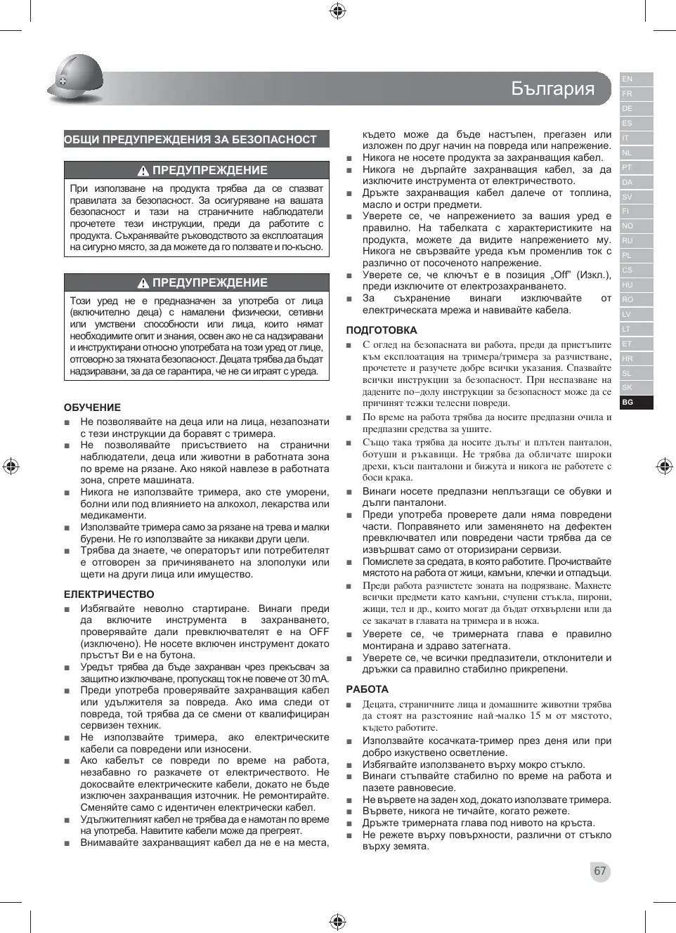 ОБЩИ ПРЕДУПРЕЖДЕНИЯ ЗА БЕЗОПАСНОСТ ПРЕДУПРЕЖДЕНИЕ При използване на продукта трябва да се спазват правилата за безопасност. За осигуряване на вашата безопасност и тази на страничните наблюдатели прочетете тези инструкции, преди да работите с продукта. Съхранявайте ръководството за експлоатация на сигурно място, за да можете да го ползвате и по-късно. ПРЕДУПРЕЖДЕНИЕ Този уред не е предназначен за употреба от лица (включително деца) с намалени физически, сетивни или умствени способности или лица, които нямат необходимите опит и знания, освен ако не са надзиравани и инструктирани относно употребата на този уред от лице, отговорно за тяхната безопасност. Децата трябва да бъдат надзиравани, за да се гарантира, че не си играят с уреда. ■ Не позволявайте на деца или на лица, незапознати с тези инструкции да боравят с тримера. ■ Не позволявайте присъствието на странични наблюдатели, деца или животни в работната зона по време на рязане. Ако някой навлезе в работната зона, спрете машината. ■ Никога не използвайте тримера, ако сте уморени, болни или под влиянието на алкохол, лекарства или медикаменти. ■ Използвайте тримера само за рязане на трева и малки бурени. Не го използвайте за никакви други цели. ■ Трябва да знаете, че операторът или потребителят е отговорен за причиняването на злополуки или щети на други лица или имущество. ЕЛЕКТРИЧЕСТВО ■ Избягвайте неволно стартиране. Винаги преди да включите инструмента в захранването, проверявайте дали превключвателят е на OFF (изключено). Не носете включен инструмент докато пръстът Ви е на бутона. ■ Уредът трябва да бъде захранван чрез прекъсвач за защитно изключване, пропускащ ток не повече от 30 mA. ■ Преди употреба проверявайте захранващия кабел или удължителя за повреда. Ако има следи от повреда, той трябва да се смени от квалифициран сервизен техник. ■ Не използвайте тримера, ако електрическите кабели са повредени или износени. ■ Ако кабелът се повреди по време на работа, незабавно го разкачете от електричеството. Не докосвайте електрическите кабели, докато не бъде изключен захранващия източник. Не ремонтирайте. Сменяйте само с идентичен електрически кабел. ■ Удължителният кабел не трябва да е намотан по време на употреба. Навитите кабели може да прегреят. ■ Внимавайте захранващият кабел да не е на места,