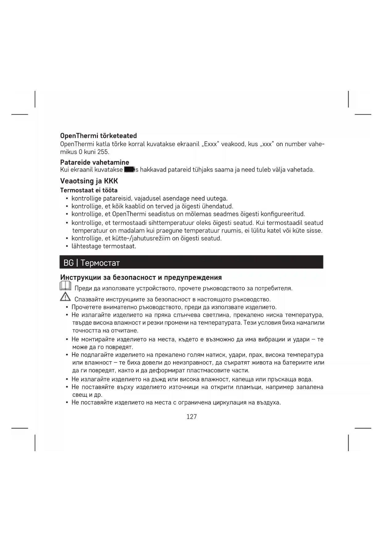 - lähtestage termostaat. BG | Термостат Инструкции за безопасност и предупреждения Преди да използвате устройството, прочете ръководството за потребителя. Спазвайте инструкциите за безопасност в настоящото ръководство.