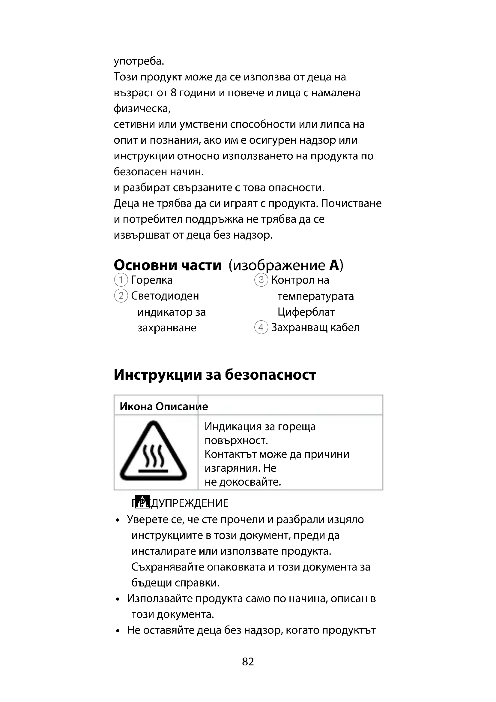сетивни или умствени способности или липса на опит и познания, ако им е осигурен надзор или инструкции относно използването на продукта по безопасен начин. и разбират свързаните с това опасности. Деца не трябва да си играят с продукта. Почистване и потребител поддръжка не трябва да се извършват от деца без надзор. Основни части (изображение A) 1 Горелка 2 Светодиоден индикатор за