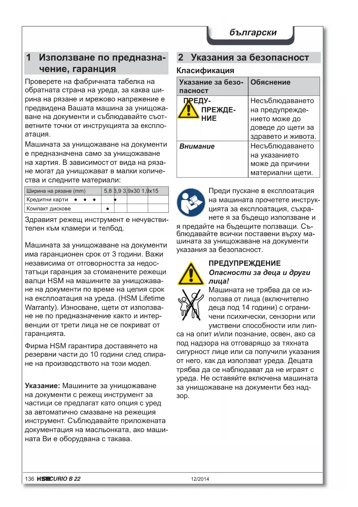 Машината за унищожаване на документи е предназначена само за унищожаване на хартия. В зависимост от вида на ряза- не могат да унищожават в малки количе- ства и следните материали: Ширина на рязане (mm) 5,8 3,9 3,9x30 1,9x15 Кредитни карти ● ● ● ● Компакт дискове ● Здравият режещ инструмент е нечувстви- телен към кламери и телбод. Указание: Машините за унищожаване на документи с режещ инструмент за частици се предлагат като опция с уред за автоматично смазване на режещия инструмент. Съблюдавайте приложената документация на масльонката, ако маши- ната Ви е оборудвана с такава. Машината за унищожаване на документи има гаранционен срок от 3 години. Важи независима от отговорността за недос- татъци гаранция за стоманените режещи валци HSM на машините за унищожава- не на документи по време на целия срок на експлоатация на уреда. (HSM Lifetime Warranty). Износване, щети от използва- не не по предназначение както и интер- венции от трети лица не се покриват от гаранцията. Фирма HSM гарантира доставянето на резервни части до 10 години след спира- не на производството на този модел.12/2014 SECURIO B 22 137