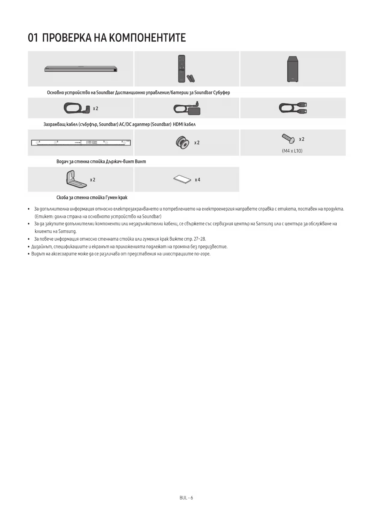 - Ще бъдете информирани за административната такса преди посещението на техника.BUL - 32 18 СПЕЦИФИКАЦИИ И РЪКОВОДСТВО Спецификации Име на модел HW-Q700A / HW-Q710A Тегло 3,6 kg Размери (Ш x В x Д) 980,0 x 60,0 x 115,0 mm Диапазон на работната температура От +5°C до +35°C Диапазон на влажност при работа 10% ~ 75%