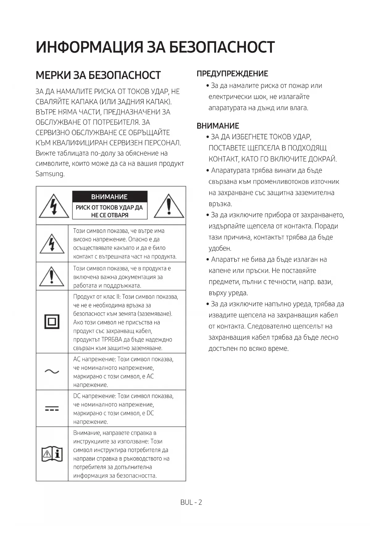 РИСК ОТ ТОКОВ УДАР ДА НЕ СЕ ОТВАРЯТози символ показва, че вътре има високо напрежение. Опасно е да осъществявате какъвто и да е било контакт с вътрешната част на продукта.Този символ показва, че в продукта е включена важна документация за работата и поддръжката.Продукт от клас II: Този символ показва, че не е необходима връзка за безопасност към земята (заземяване). Ако този символ не присъства на продукт със захранващ кабел, продуктът ТРЯБВА да бъде надеждно свързан към защитно заземяване. AC напрежение: Този символ показва, че номиналното напрежение, маркирано с този символ, е AC напрежение.DC напрежение: Този символ показва, че номиналното напрежение, маркирано с този символ, е DC напрежение.Внимание, направете справка в инструкциите за използване: Този символ инструктира потребителя да направи справка в ръководството на потребителя за допълнителна информация за безопасността. ПРЕДУПРЕЖДЕНИЕ