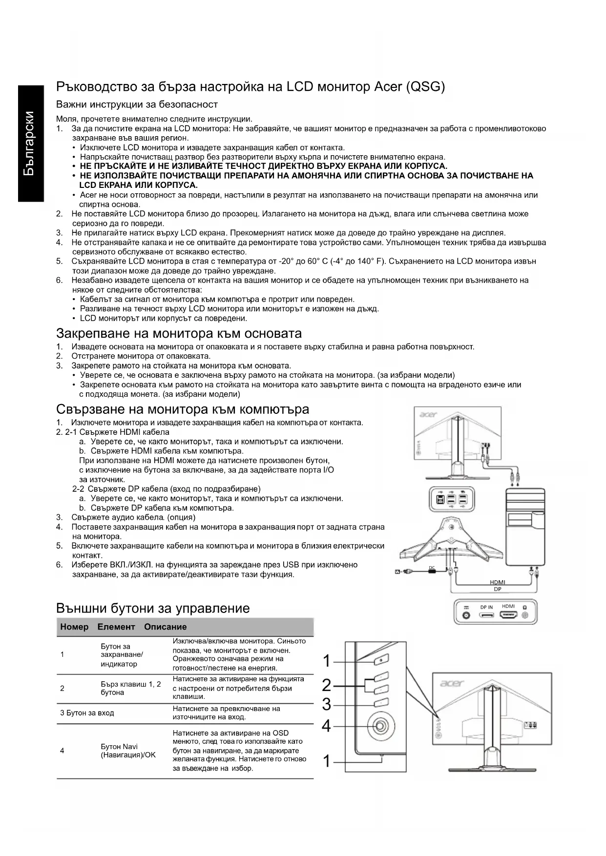 4Български Разпоредби и бележки за безопасност Бележка от Федералната комисия за комуникации (ФКК) Това устройство е тествано и отговаря на ограниченията за цифрово устройство от клас B, съгласно част 15 от правилата на ФКК. Тези ограничения са предназначени да осигуряват разумна защита срещу вредни смущения в жилищни инсталации. Това устройство генерира, използва и може да излъчва радиочестотна енергия и ако не бъде монтирано и използвано, в съответствие с инструкциите, може да причини вредни смущения на радио комуникациите. Въпреки това, няма гаранции, че няма да възникнат смущения в конкретна инсталация. Ако устройството причинява вредни смущения на радио и телевизионно приемане, което може да се установи чрез изключване и включване на устройството, потребителят се насърчава да се опита да коригира смущението чрез една от следните мерки: Преориентиране или преместване на антената на приемника. Увеличаване на разстоянието между устройството и приемника. Свързване на устройството в контакт във верига, която е различна от тази, в която е свързан приемникът. Консултация с доставчик или опитен радио/телевизионен техник за помощ. CE декларация за съответствие С настоящето, Acer Inc., декларира, че този LCD монитор е в съответствие със съществените изисквания и други приложими разпоредби на директивата за електромагнитна съвместимост (EMC) 2014/30/ЕC, директивата за ниско напрежение 2014/35/ЕC и RoHS директивата 2011/65/ЕC, и директива 2009/125/EО по отношение на създаването на рамка за определяне на изискванията за екодизайн за продукти, свързани с енергопотребление.