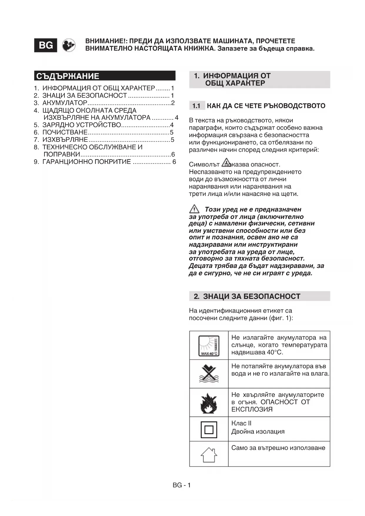 батерия / зарядно устройство - УПЪТВАНЕ ЗА УПОТРЕБА ВНИМАНИЕ: преди да използвате машината прочетете внимателно настоящата книжка.