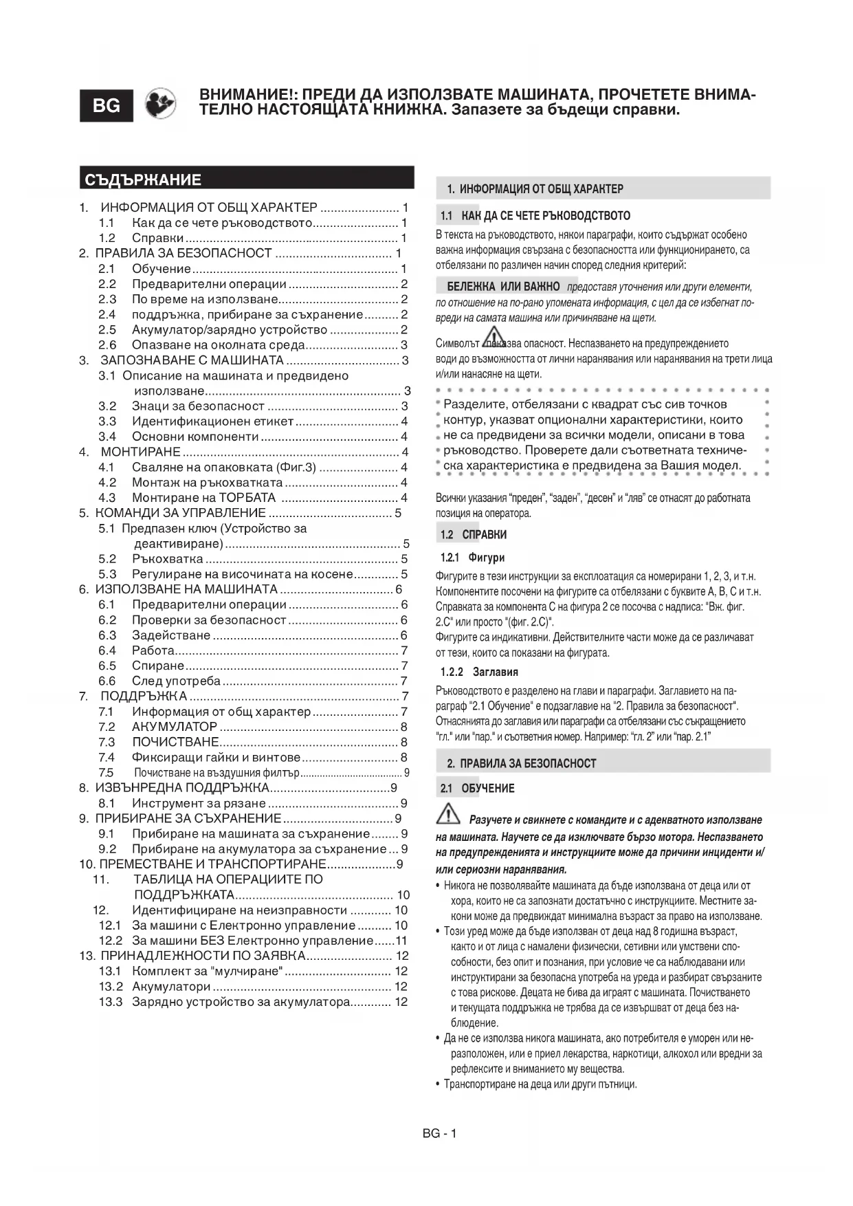 ВАЖНО Следните правила за безопасност допълват предписанията за безопасност, които се съдържат в съответната книжка с инструкции за акумулатора и зарядното устройство, приложена към машината.