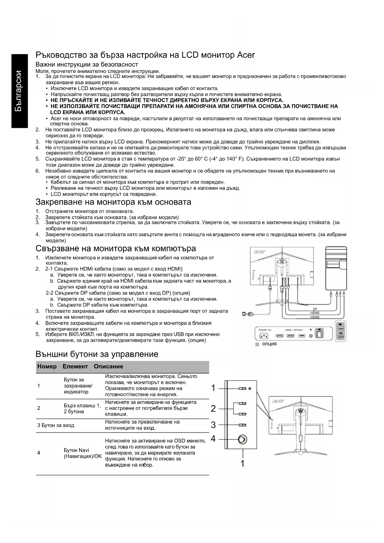 a. Уверете се, че както мониторът, така и компютърът са изключени. b. Свържете единия край на HDMI кабела към задната част на монитора, а другия край към порта на компютъра. 2-2 Свържете DP кабела (само за модел с вход DP) (опция) a. Уверете се, че както мониторът, така и компютърът са изключени. b. Свържете DP кабела към компютъра.