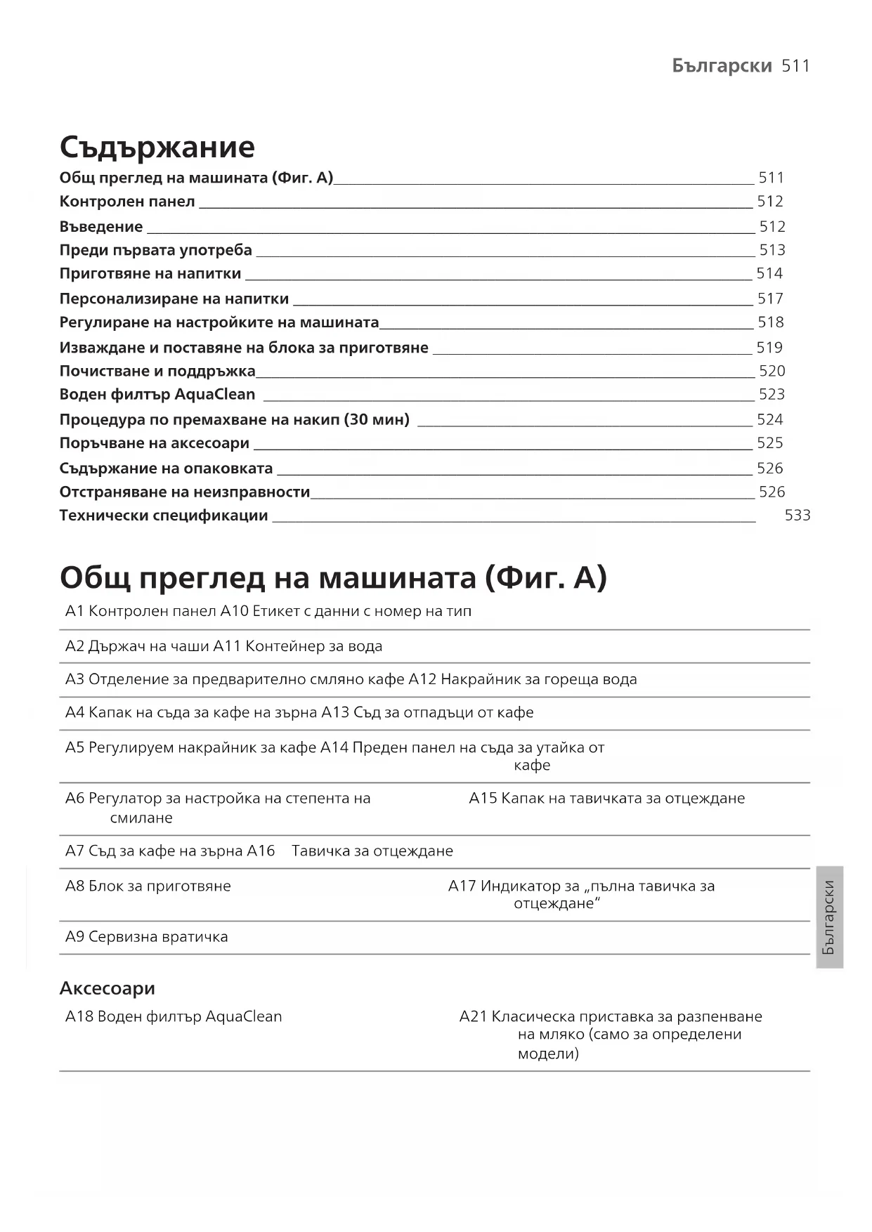 БългарскиБългарски Общ преглед на машината (Фиг. А)______________________________________________________ 511Контролен панел _______________________________________________________________________ 512Въведение ______________________________________________________________________________ 512Преди първата употреба ________________________________________________________________ 513Приготвяне на напитки _________________________________________________________________ 514Персонализиране на напитки ___________________________________________________________ 517Регулиране на настройките на машината________________________________________________ 518Изваждане и поставяне на блока за приготвяне _________________________________________ 519Почистване и поддръжка________________________________________________________________ 520Воден филтър AquaClean _______________________________________________________________ 523Процедура по премахване на накип (30 мин) ___________________________________________ 524Поръчване на аксесоари ________________________________________________________________ 525Съдържание на опаковката _____________________________________________________________ 526Отстраняване на неизправности_________________________________________________________ 526 Технически спецификации ______________________________________________________________ 533 Общ преглед на машината (Фиг. А) A1 Контролен панел A10 Етикет с данни с номер на типA2 Държач на чаши A11 Контейнер за водаA3 Отделение за предварително смляно кафе A12 Накрайник за гореща водаA4 Капак на съда за кафе на зърна A13 Съд за отпадъци от кафеA5 Регулируем накрайник за кафе A14 Преден панел на съда за утайка от A6 Регулатор за настройка на степента насмиланеA15 Капак на тавичката за отцежданеA7 Съд за кафе на зърна A16 Тавичка за отцежданеA8 Блок за приготвяне A17 Индикатор за „пълна тавичка заотцеждане“A9 Сервизна вратичка A18 Воден филтър AquaClean A21 Класическа приставка за разпенванена мляко (само за определенимодели)512