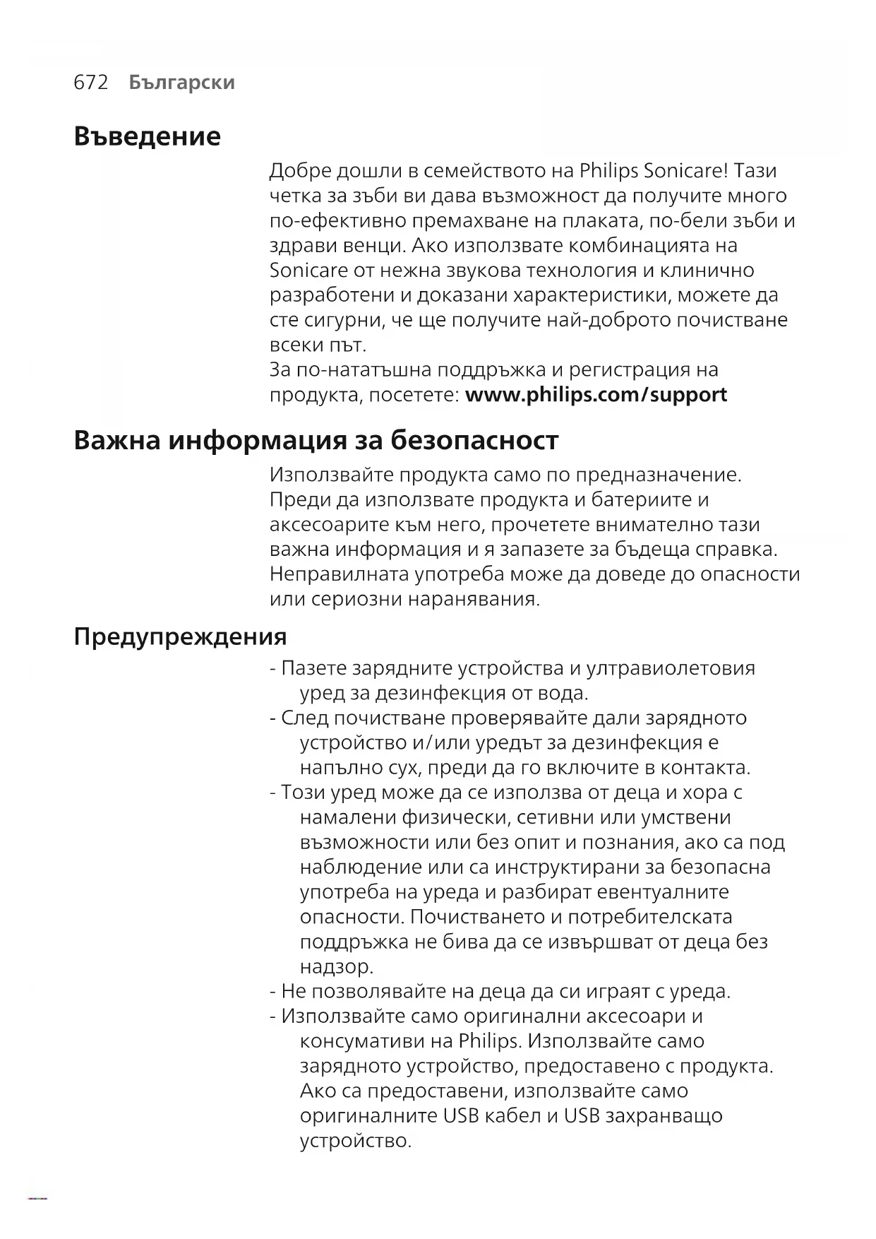 - Не позволявайте на деца да си играят с уреда. - Използвайте само оригинални аксесоари и консумативи на Philips. Използвайте само зарядното устройство, предоставено с продукта. Ако са предоставени, използвайте само оригиналните USB кабел и USB захранващо устройство.673