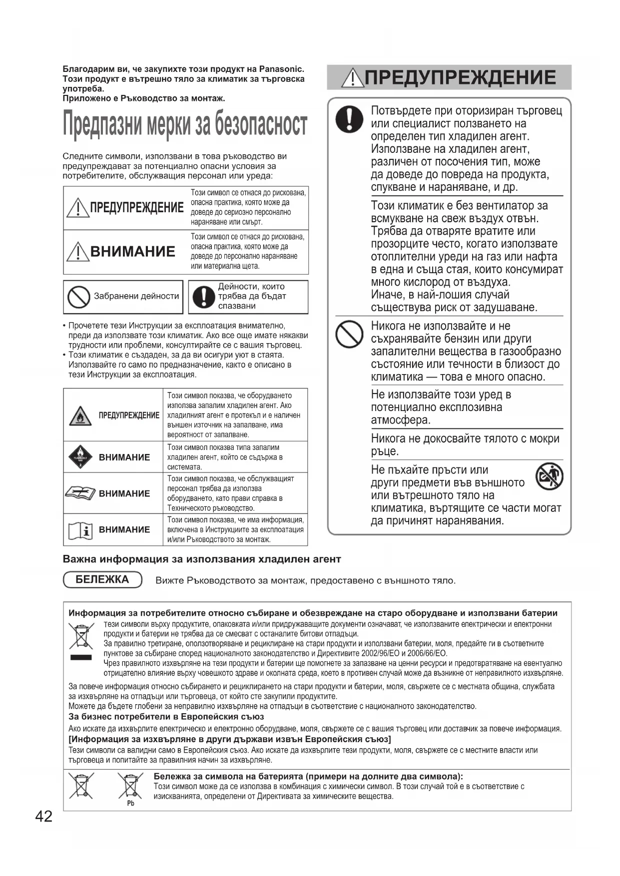 00_330596_all.indb 41 2021/4/14 13:07:0942 Благодарим ви, че закупихте този продукт на Panasonic.Този продукт е вътрешно тяло за климатик за търговска употреба.Приложено е Ръководство за монтаж. Предпазни мерки за безопасност Следните символи, използвани в това ръководство ви предупреждават за потенциално опасни условия за потребителите, обслужващия персонал или уреда: ПРЕДУПРЕЖДЕНИЕ Този символ се отнася до рискована, опасна практика, която може да доведе до сериозно персонално нараняване или смърт. Този символ се отнася до рискована, опасна практика, която може да доведе до персонално нараняване или материална щета.Забранени дейностиДейности, които трябва да бъдат спазвани