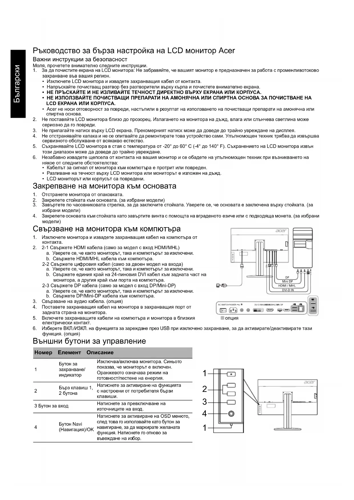 4Български Разпоредби и бележки за безопасност Бележка от Федералната комисия за комуникации (ФКК) Това устройство е тествано и отговаря на ограниченията за цифрово устройство от клас B, съгласно част 15 от правилата на ФКК. Тези ограничения са предназначени да осигуряват разумна защита срещу вредни смущения в жилищни инсталации. Това устройство генерира, използва и може да излъчва радиочестотна енергия и ако не бъде монтирано и използвано, в съответствие с инструкциите, може да причини вредни смущения на радио комуникациите. Въпреки това, няма гаранции, че няма да възникнат смущения в конкретна инсталация. Ако устройството причинява вредни смущения на радио и телевизионно приемане, което може да се установи чрез изключване и включване на устройството, потребителят се насърчава да се опита да коригира смущението чрез една от следните мерки: Преориентиране или преместване на антената на приемника. Увеличаване на разстоянието между устройството и приемника. Свързване на устройството вконтакт във верига, която е различна от тази, вкоято е свързан приемникът. Консултация сдоставчик или опитен радио/телевизионен техник за помощ. CE декларация за съответствие С настоящето, Acer Inc., декларира, че този LCD монитор е в съответствие със съществените изисквания и други приложими разпоредби на директивата за електромагнитна съвместимост (EMC) 2014/30/ЕC, директивата за ниско напрежение 2014/35/ЕC и RoHS директивата 2011/65/ЕC, и директива 2009/125/EО по отношение на създаването на рамка за определяне на изискванията за екодизайн за продукти, свързани с енергопотребление.