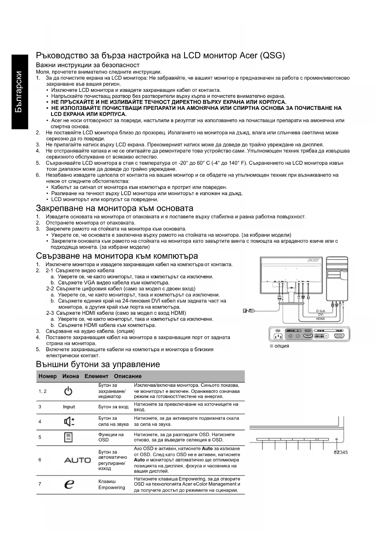 Бутон за автоматично регулиране/изход Ако OSD е активен, натиснете Auto за излизане от OSD. След като OSD не е активен, натиснете Auto и мониторът автоматично ще оптимизира позицията на дисплея, фокуса и часовника на вашия дисплей. Клавиш Empowering Натиснете клавиша Empowering, за да отворите OSD на технологията Acer eColor Management и да получите достъп до режимите на сценарии. HDMI DVI D-SubHDMI
