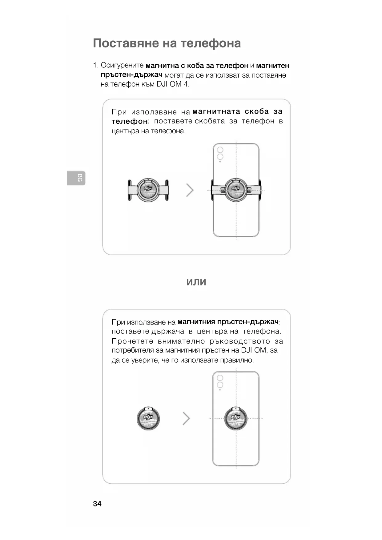 поставете държача в центъра на телефона. Прочетете внимателно ръководството за потребителя за магнитния пръстен на DJI OM, за да се уверите, че го използвате правилно. ИЛИ35
