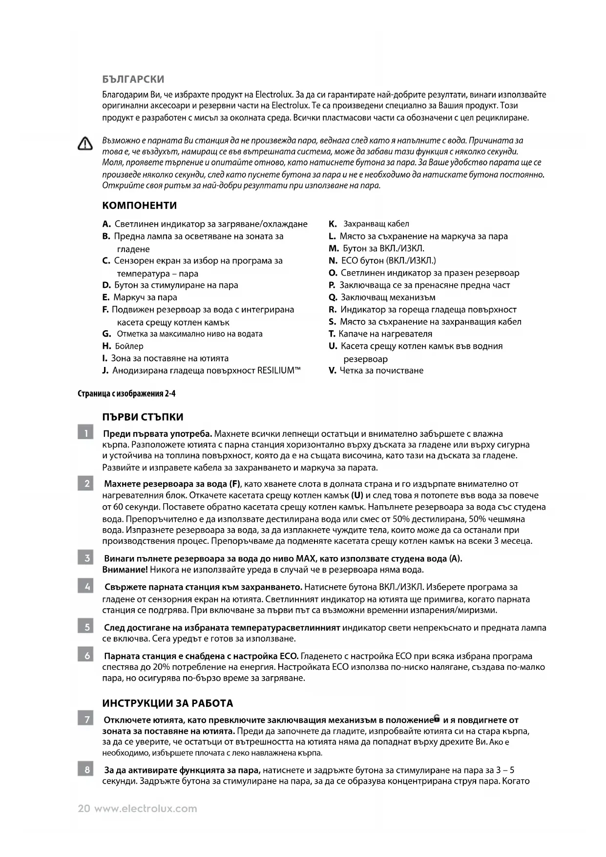 Благодарим Ви, че избрахте продукт на Electrolux. За да си гарантирате най-добрите резултати, винаги използвайте оригинални аксесоари и резервни части на Electrolux. Те са произведени специално за Вашия продукт. Този продукт е разработен с мисъл за околната среда. Всички пластмасови части са обозначени с цел рециклиране. Възможно е парната Ви станция да не произвежда пара, веднага след като я напълните с вода. Причината за това е, че въздухът, намиращ се във вътрешната система, може да забави тази функция с няколко секунди. Моля, проявете търпение и опитайте отново, като натиснете бутона за пара. За Ваше удобство парата ще се произведе няколко секунди, след като пуснете бутона за пара и не е необходимо да натискате бутона постоянно. Открийте своя ритъм за най-добри резултати при използване на пара.