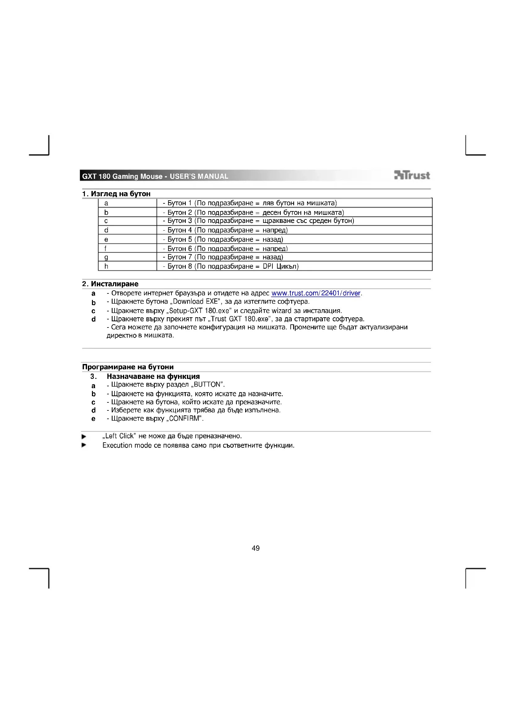 „Left Click” не може да бъде преназначено. Execution mode се появява само при съответните функции.GXT 180 Gaming Mouse - USER’S MANUAL