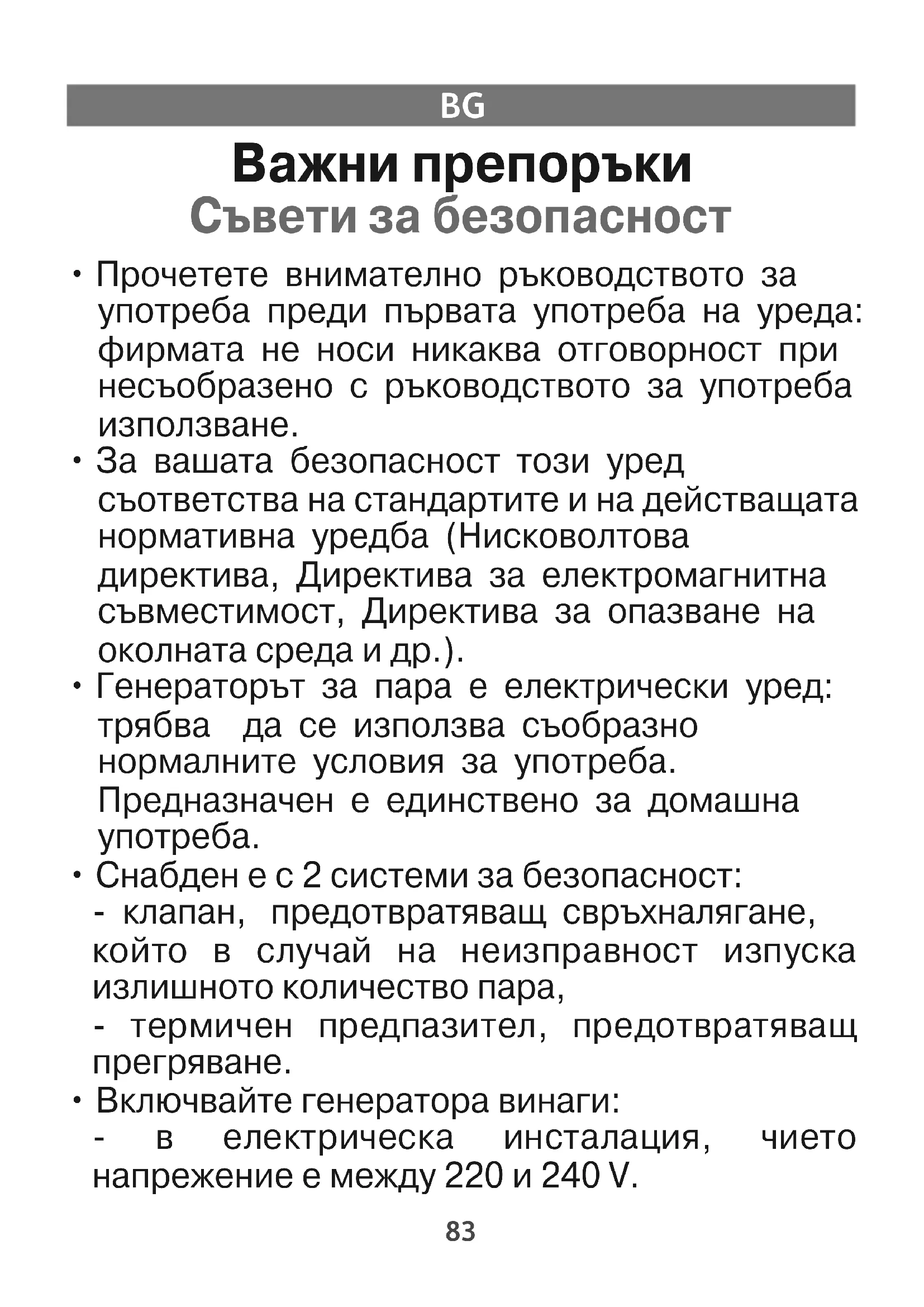 - Генераторът за пара е електрически уред: трябва да се използва съобразно нормалните условия за употреба. Предназначен е единствено за домашна