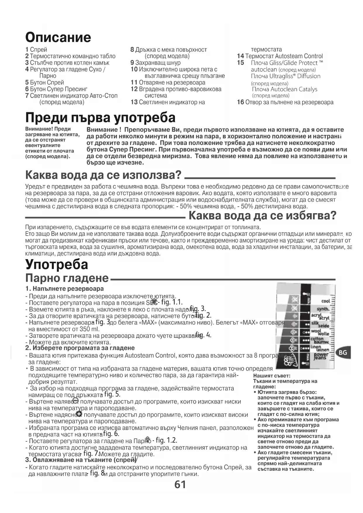 1 Спрей2 Термостатично командно табло3 Стълбче против котлен камък4 Регулатор за гладене Сухо /Парно5 Бутон Спрей6 Бутон Супер Пресинг7 Светлинен индикатор Авто-Стоп(според модела)8 Дръжка с мека повърхност(според модела)9 Захранващ шнур10 Изключително широка пета свъзглавничка срещу плъзгане11 Отваряне на резервоара12 Вградена противо-варовиковасистема13 Светлинен индикатор натермостата14 Термостат Autosteam Control Плоча Gliss/Glide Protect ™autoclean (според модела)Плоча Ultragliss® Diffusion(според модела)Плоча Autoclean Catalys(според модела)16 Отвор за пълнене на резервоара Преди първа употреба Внимание ! Препоръчваме Ви, преди първото използване на ютията, да я оставитеда работи няколко минути в режим на пара, в хоризонтално положение и настраниот дрехите за гладене. При това положение трябва да натиснете неколкократнобутона Супер Пресинг. При първоначална употреба е възможно да се появи дим илида се отдели безвредна миризма. Това явление няма да повлияе на използването ибързо ще изчезне. Каква вода да се използва? Уредът е предвиден за работа с чешмяна вода. Въпреки това е необходимо редовно да се прави самопочистванена резервоара за пара, за да се отстрани отложения варовик. Ако водата, която използвате е много варовита(това може да се провери в общинската администрация или водоснабдителната служба), могат да се смесятчешмяна с дестилирана вода в следната пропорция: - 50% чешмяна вода, - 50% дестилирана вода. Каква вода да се избягва? При изпарението, съдържащите се във водата елементи се концентрират от топлината.Ето защо Ви молим да не използвате такава вода. Долуизброените води съдържат органични отпадъци или минерали, коитомогат да предизвикат кафеникави пръски или течове, както и преждевременно амортизиране на уреда: чист дестилат оттърговската мрежа, вода за сушилня, ароматизирана вода, омекотена вода, вода за хладилни инсталации, за батерии, заклиматици, дестилирана вода или дъждовна вода.