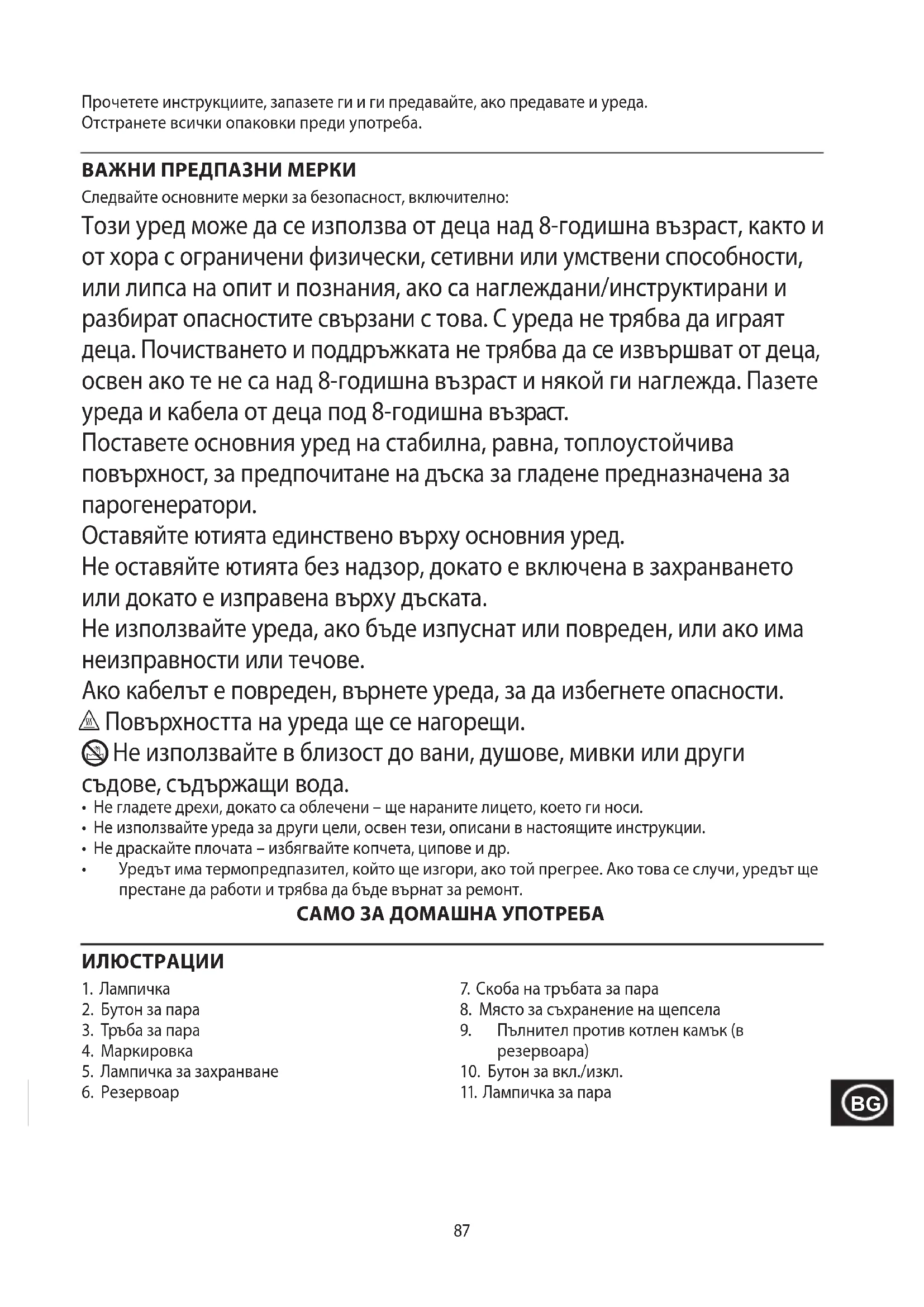 Pentru a evita problemele de mediu și de sănătate cauzate de substanțele periculoase, aparatele și bateriile reîncărcabile și cele obișnuite marcate cu unul dintre aceste simboluri, nu trebuie eliminate împreună cu deșeurile municipale nesortate. Eliminați întotdeauna produsele electrice și electronice și, după caz, bateriile reîncărcabile și cele obișnuite, la un punct de reciclare/colectare corespunzător.87 Прочетете инструкциите, запазете ги и ги предавайте, ако предавате и уреда. Отстранете всички опаковки преди употреба. ВАЖНИ ПРЕДПАЗНИ МЕРКИ Следвайте основните мерки за безопасност, включително: Този уред може да се използва от деца над 8-годишна възраст, както и от хора с ограничени физически, сетивни или умствени способности, или липса на опит и познания, ако са наглеждани/инструктирани и разбират опасностите свързани с това. С уреда не трябва да играят деца. Почистването и поддръжката не трябва да се извършват от деца, освен ако те не са над 8-годишна възраст и някой ги наглежда. Пазете уреда и кабела от деца под 8-годишна възраст. Поставете основния уред на стабилна, равна, топлоустойчива повърхност, за предпочитане на дъска за гладене предназначена за парогенератори. Оставяйте ютията единствено върху основния уред. Не оставяйте ютията без надзор, докато е включена в захранването или докато е изправена върху дъската. Не използвайте уреда, ако бъде изпуснат или повреден, или ако има неизправности или течове. Ако кабелът е повреден, върнете уреда, за да избегнете опасности. h Повърхността на уреда ще се нагорещи.