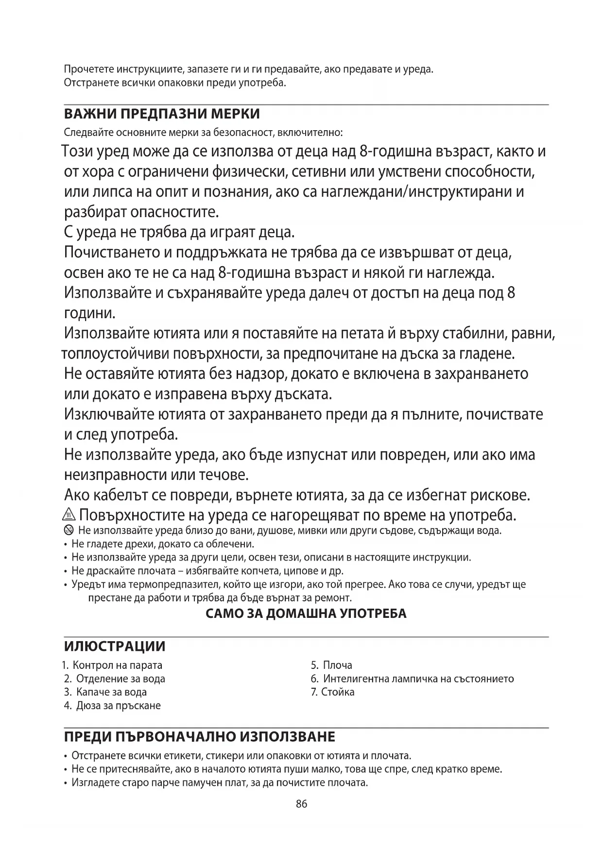 AE86 Прочетете инструкциите, запазете ги и ги предавайте, ако предавате и уреда. Отстранете всички опаковки преди употреба. ВАЖНИ ПРЕДПАЗНИ МЕРКИ Следвайте основните мерки за безопасност, включително: Този уред може да се използва от деца над 8-годишна възраст, както и от хора с ограничени физически, сетивни или умствени способности, или липса на опит и познания, ако са наглеждани/инструктирани и разбират опасностите. С уреда не трябва да играят деца. Почистването и поддръжката не трябва да се извършват от деца, освен ако те не са над 8-годишна възраст и някой ги наглежда. Използвайте и съхранявайте уреда далеч от достъп на деца под 8