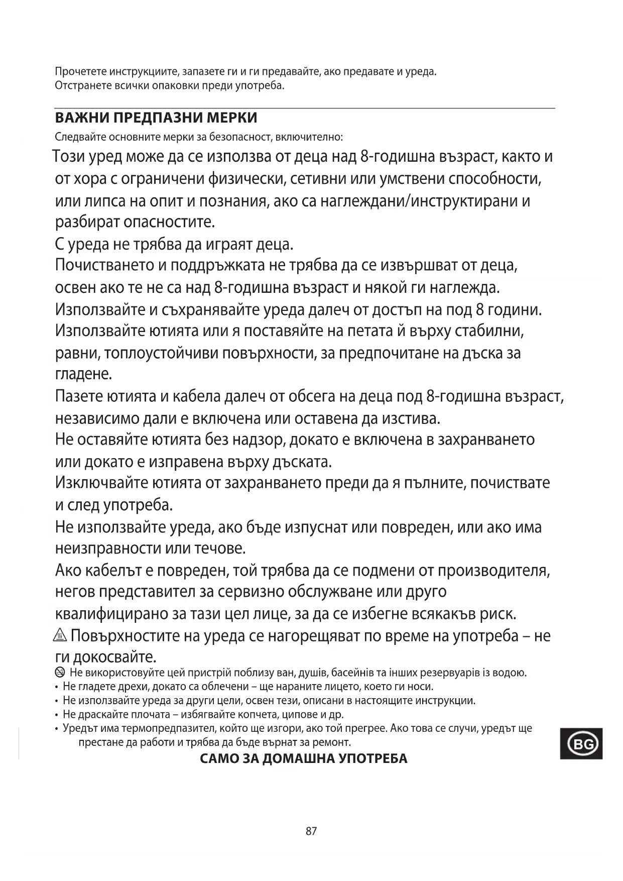 Pentru a evita problemele de mediu și de sănătate cauzate de substanțele periculoase, aparatele și bateriile reîncărcabile și cele obișnuite marcate cu unul dintre aceste simboluri, nu trebuie eliminate împreună cu deșeurile municipale nesortate. Eliminați întotdeauna produsele electrice și electronice și, după caz, bateriile reîncărcabile și cele obișnuite, la un punct de reciclare/colectare corespunzător.87 Прочетете инструкциите, запазете ги и ги предавайте, ако предавате и уреда. Отстранете всички опаковки преди употреба. ВАЖНИ ПРЕДПАЗНИ МЕРКИ Следвайте основните мерки за безопасност, включително: Този уред може да се използва от деца над 8-годишна възраст, както и от хора с ограничени физически, сетивни или умствени способности, или липса на опит и познания, ако са наглеждани/инструктирани и разбират опасностите. С уреда не трябва да играят деца. Почистването и поддръжката не трябва да се извършват от деца, освен ако те не са над 8-годишна възраст и някой ги наглежда. Използвайте и съхранявайте уреда далеч от достъп на под 8 години. Използвайте ютията или я поставяйте на петата й върху стабилни, равни, топлоустойчиви повърхности, за предпочитане на дъска за