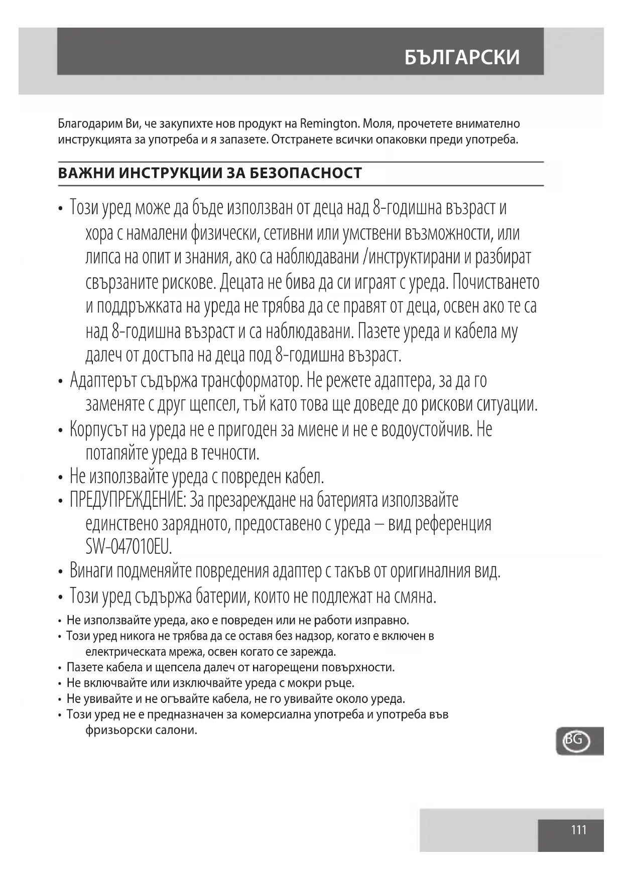 Благодарим Ви, че закупихте нов продукт на Remington. Моля, прочетете внимателно инструкцията за употреба и я запазете. Отстранете всички опаковки преди употреба. ВАЖНИ ИНСТРУКЦИИ ЗА БЕЗОПАСНОСТ