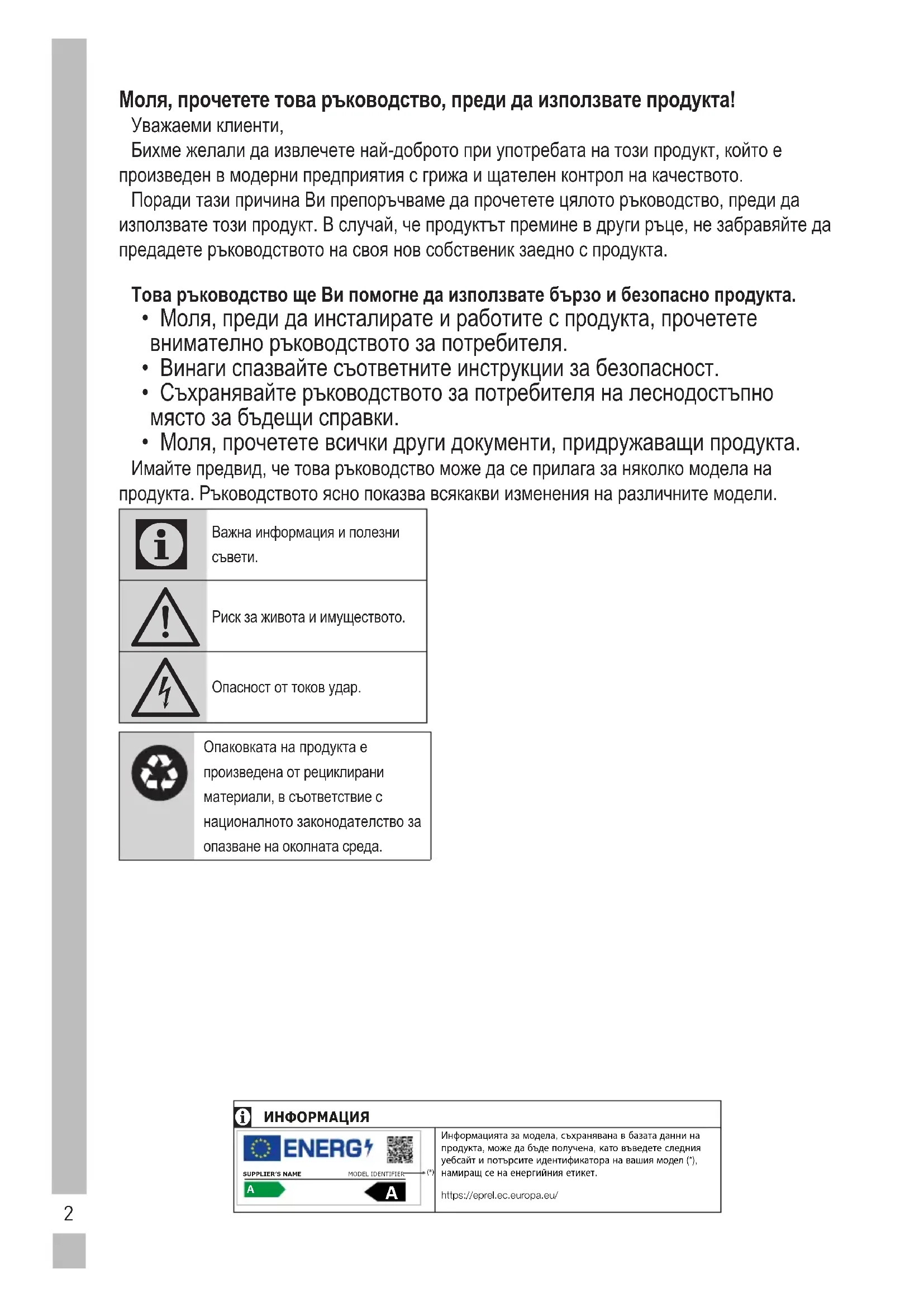 Важна информация и полезни съвети. Риск за живота и имуществото. Опасност от токов удар.Опаковката на продукта е произведена от рециклирани материали, в съответствие с националното законодателство за опазване на околната среда.
