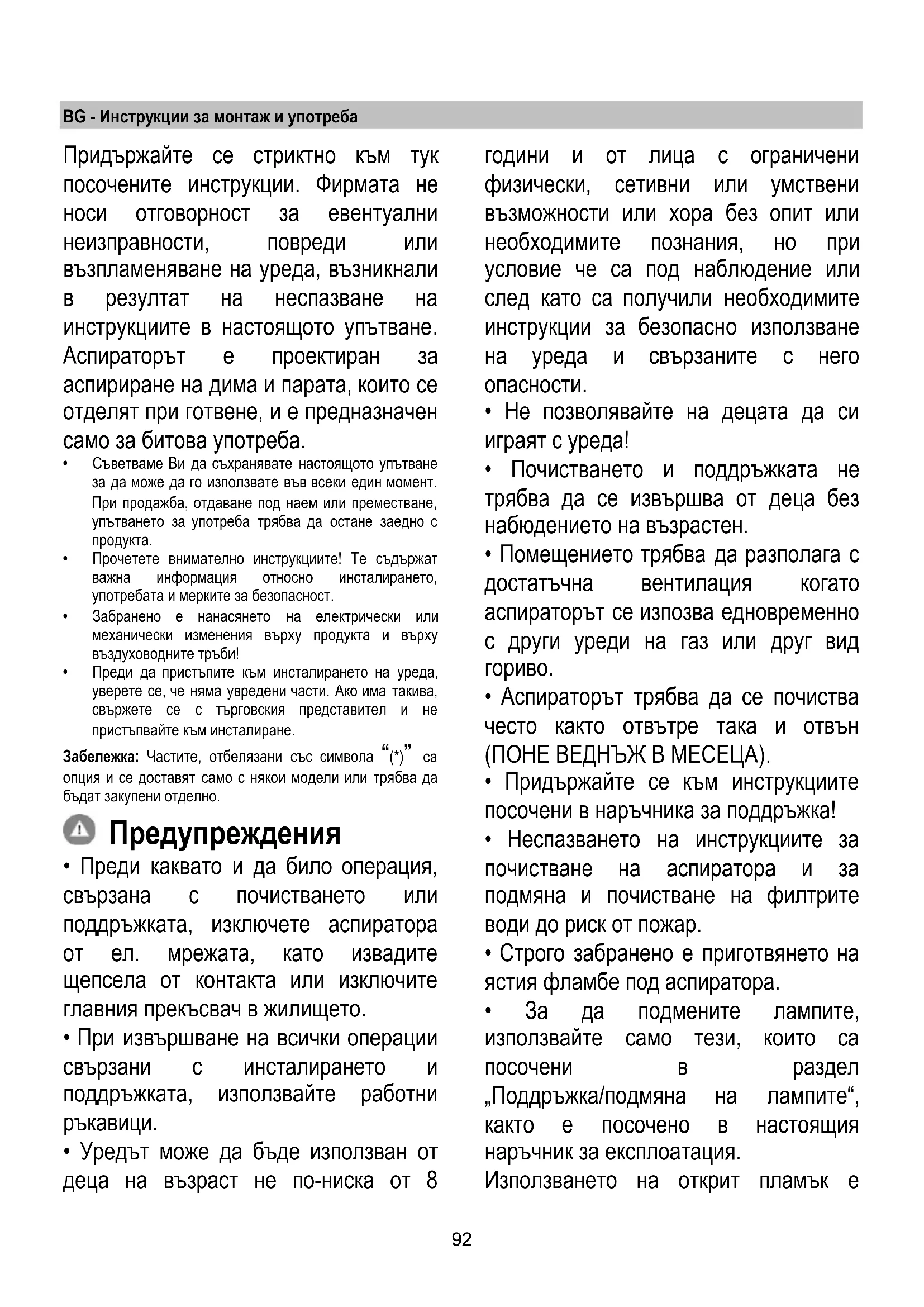 - Не използвайте и не оставяйте аспиратора без правилно монтирани лампички поради евентуален риск от токов