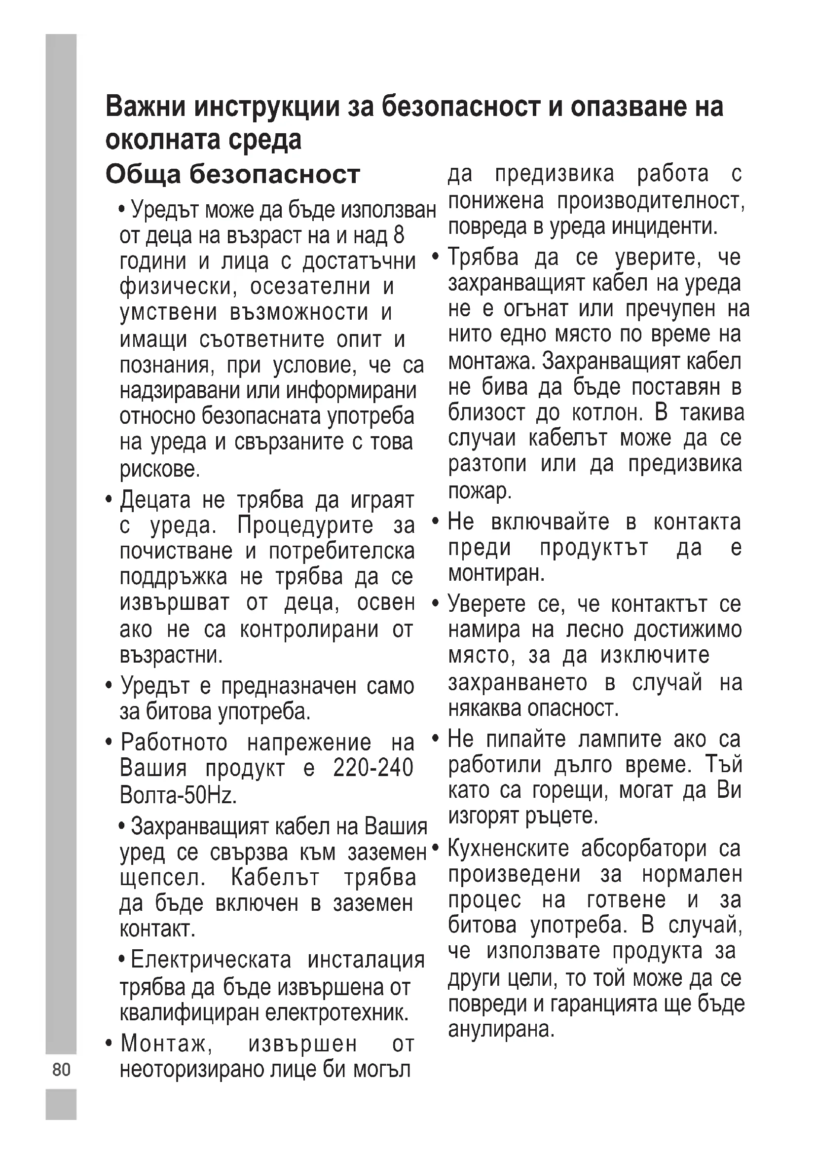 - В околната среда, където се използва абсорбатора, отработеният въздух от устройства, захранвани с газ или течно гориво, като например стайна печка, трябва Важни инструкции за безопасност и опазване на околната среда82 да бъде напълно изолиран или устройството да бъде от херметически изолиран вид.