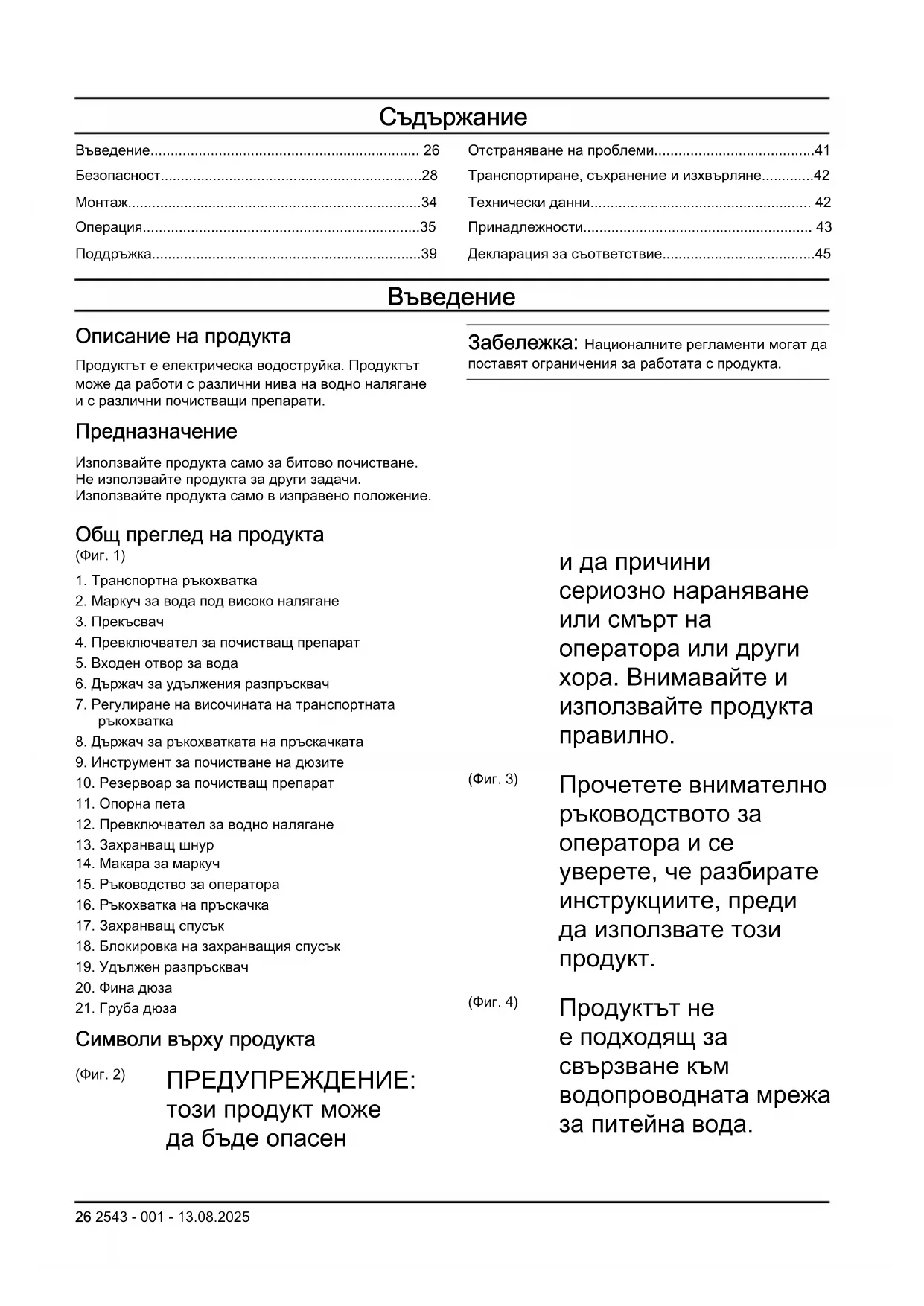 (Фиг. 4) Продуктът не е подходящ за свързване към водопроводната мрежа за питейна вода. 26 2543 - 001 - 13.08.2025(Фиг. 5) Водните струи под високо налягане могат да бъдат опасни при подлагане на неправилна употреба. Струята не трябва да се насочва към лица, електрическо оборудване или