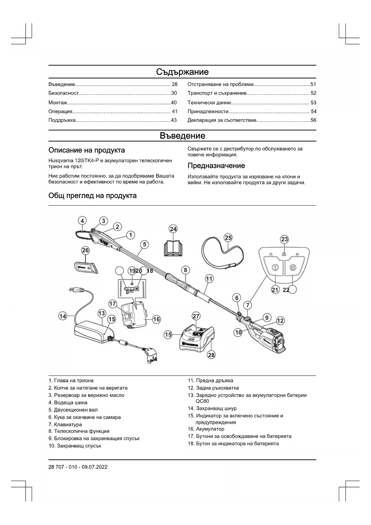 Описание на продукта Husqvarna 120iTK4-P е акумулаторен телескопичен трион на прът. Ние работим постоянно, за да подобряваме Вашата безопасност и ефективност по време на работа. Свържете се с дистрибутор по обслужването за повече информация. Предназначение Използвайте продукта за изрязване на клони и вейки. Не използвайте продукта за други задачи. Общ преглед на продукта