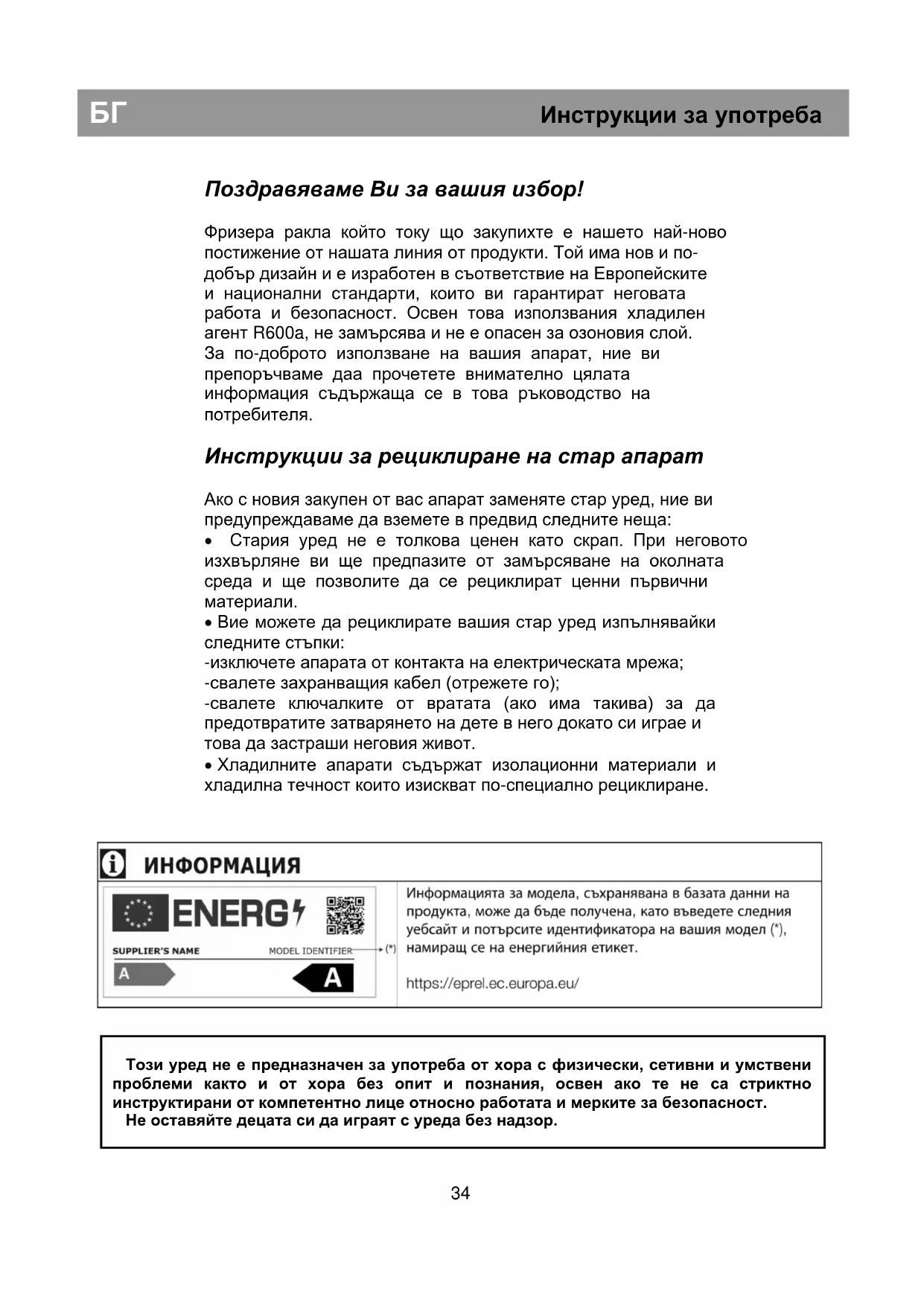 Този уред не е предназначен за употреба от хора с физически, сетивни и умствени проблеми както и от хора без опит и познания, освен ако те не са стриктно инструктирани от компетентно лице относно работата и мерките за безопасност. Не оставяйте децата си да играят с уреда без надзор. БГ Инструкции за употребаРъководство за ползване Рециклиране на опаковката