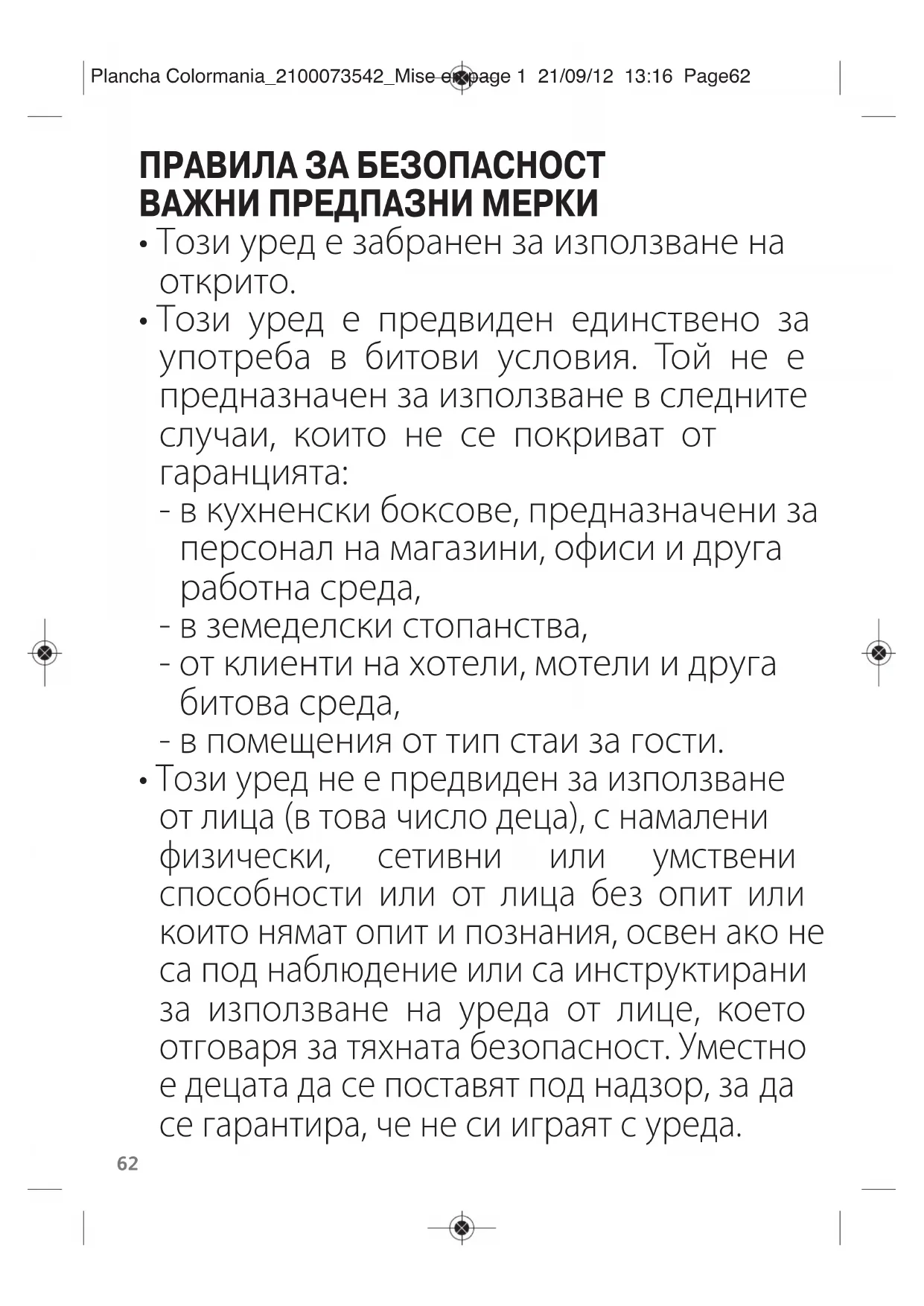 - Този уред не е предвиден за използване от лица (в това число деца), с намалени физически, сетивни или умствени способности или от лица без опит или които нямат опит и познания, освен ако не са под наблюдение или са инструктирани за използване на уреда от лице, което отговаря за тяхната безопасност. Уместно е децата да се поставят под надзор, за да се гарантира, че не си играят с уреда. Plancha Colormania_2100073542_Mise en page 1 21/09/12 13:16 Page62FR