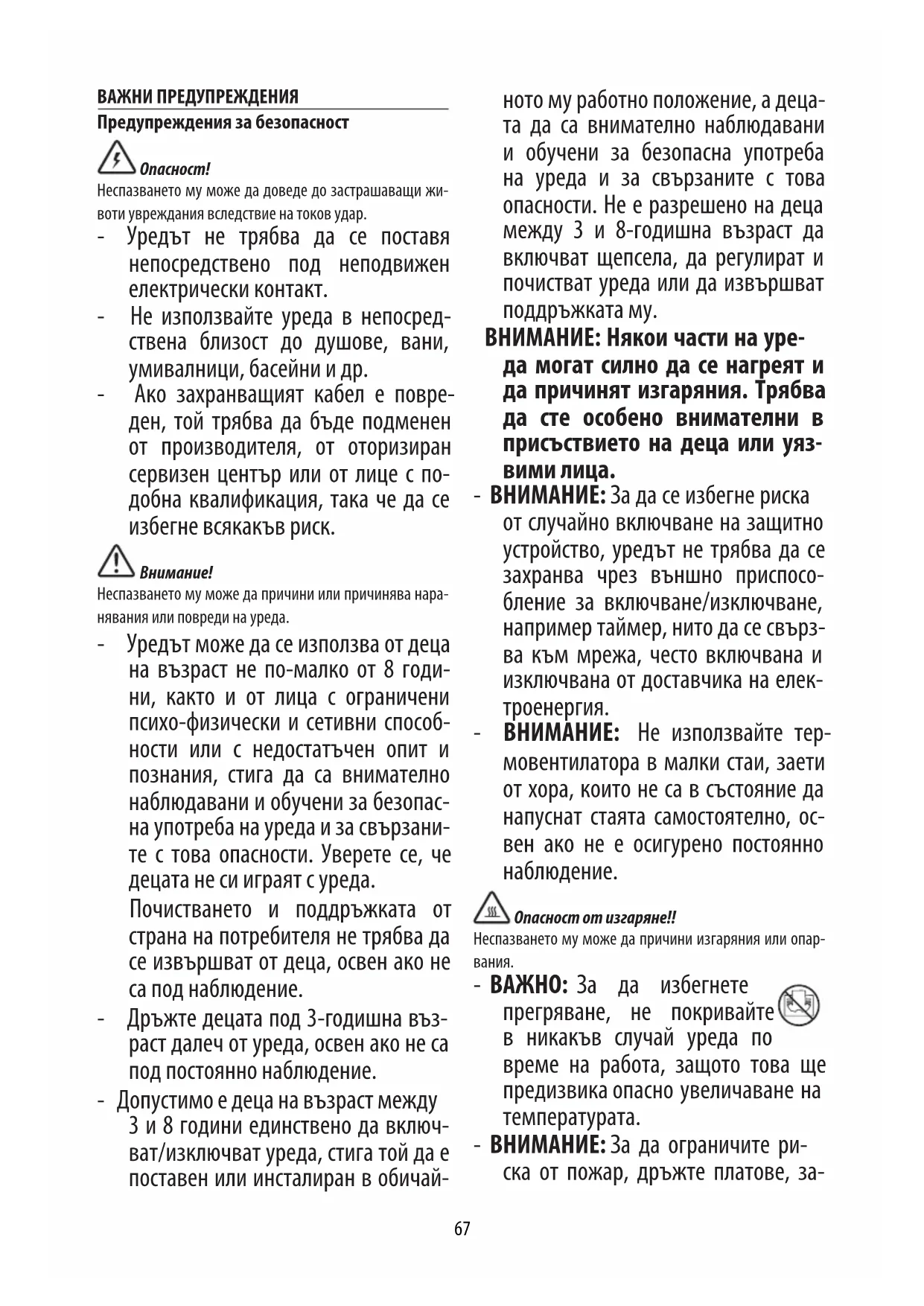 - ВНИМАНИЕ: За да се избегне риска от случайно включване на защитно устройство, уредът не трябва да се захранва чрез външно приспосо- бление за включване/изключване, например таймер, нито да се свърз- ва към мрежа, често включвана и изключвана от доставчика на елек- троенергия. - ВНИМАНИЕ: Не използвайте тер- мовентилатора в малки стаи, заети от хора, които не са в състояние да напуснат стаята самостоятелно, ос- вен ако не е осигурено постоянно наблюдение. Опасност от изгаряне!! Неспазването му може да причини изгаряния или опар-