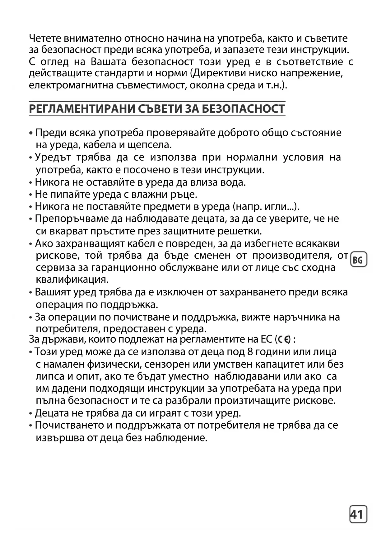 Четете внимателно относно начина на употреба, както и съветите за безопасност преди всяка употреба, и запазете тези инструкции. С оглед на Вашата безопасност този уред е в съответствие с действащите стандарти и норми (Директиви ниско напрежение, електромагнитна съвместимост, околна среда и т.н.). РЕГЛАМЕНТИРАНИ СЪВЕТИ ЗА БЕЗОПАСНОСТ