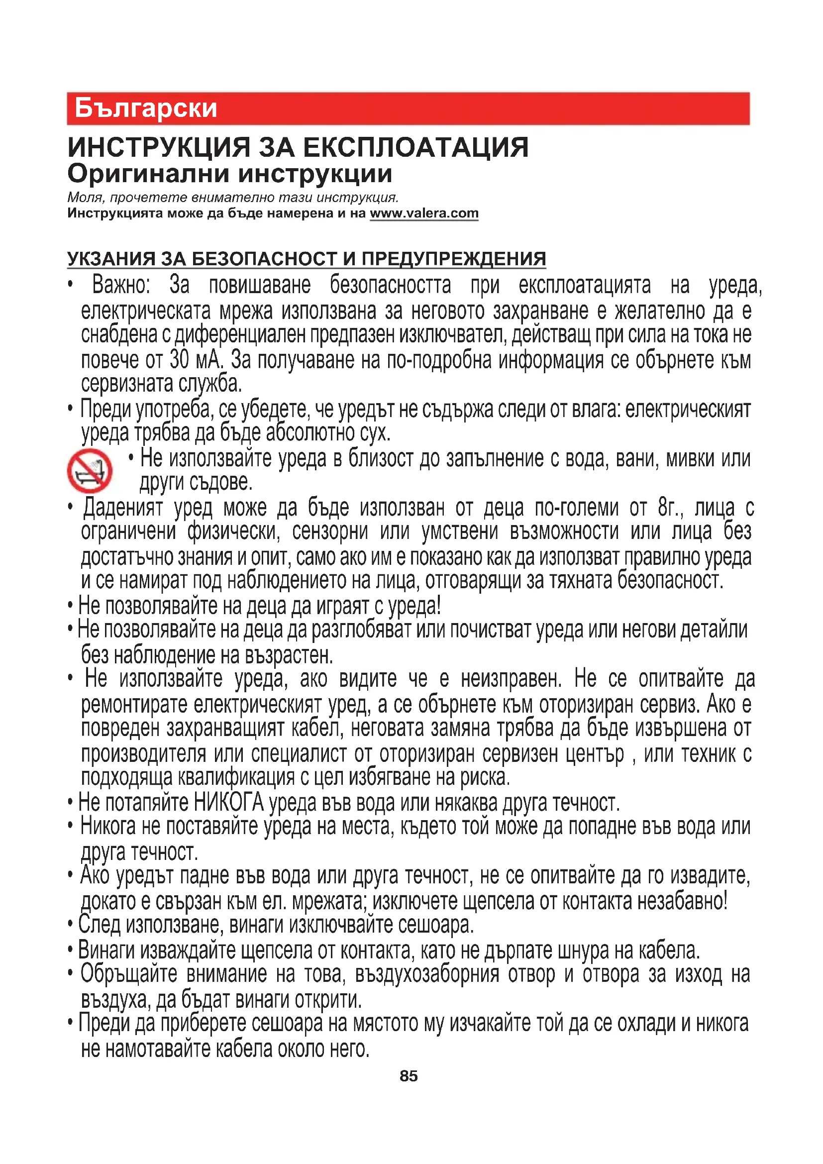 ИНСТРУКЦИЯ ЗА ЕКСПЛОАТАЦИЯ Оригинални инструкции Моля, прочетете внимателно тази инструкция. Инструкцията може да бъде намерена и на www.valera.com