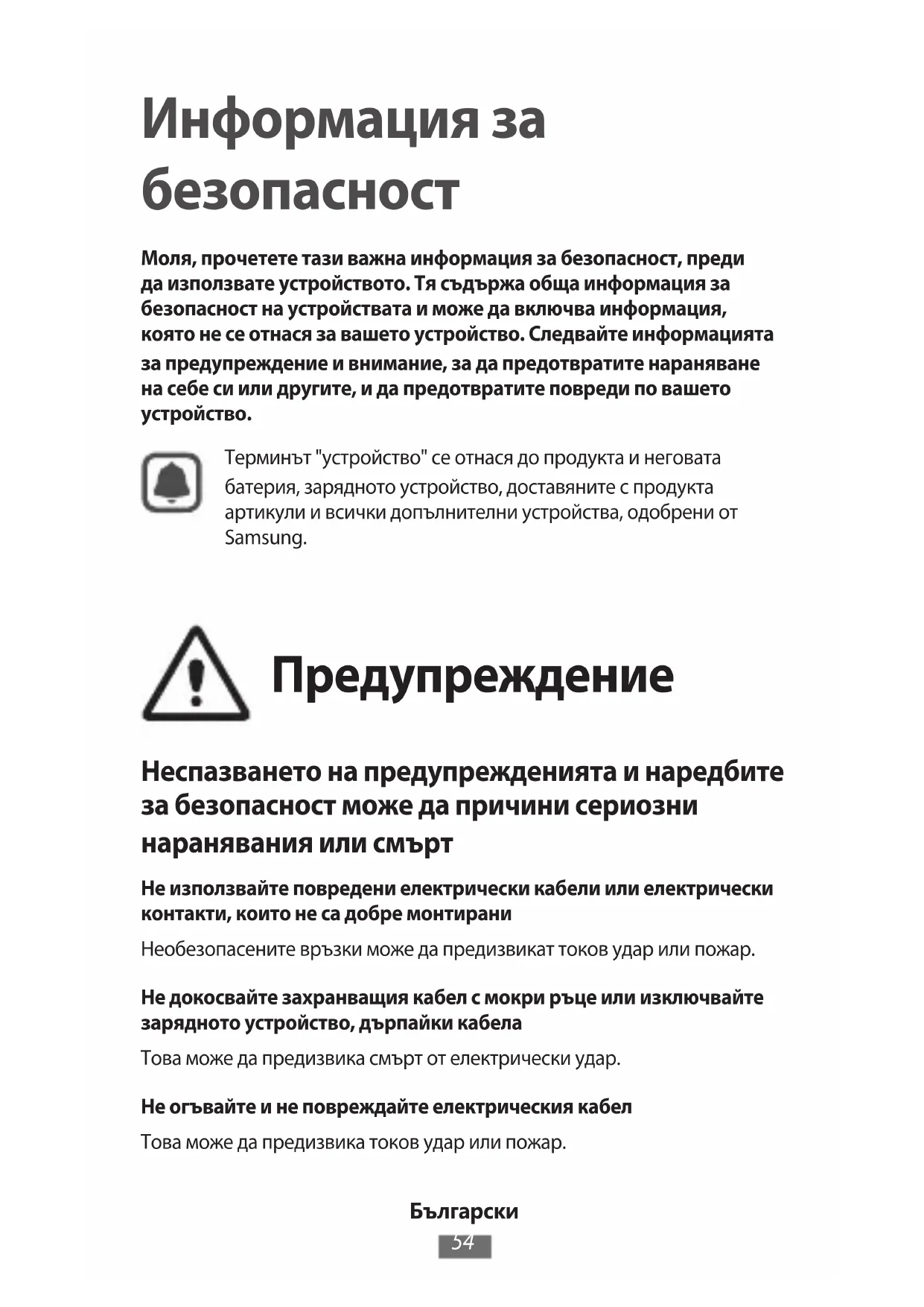 Информация за безопасност Моля, прочетете тази важна информация за безопасност, преди да използвате устройството. Тя съдържа обща информация за безопасност на устройствата и може да включва информация, която не се отнася за вашето устройство. Следвайте информацията за предупреждение и внимание, за да предотвратите нараняване на себе си или другите, и да предотвратите повреди по вашето устройство.Терминът "устройство" се отнася до продукта и неговата батерия, зарядното устройство, доставяните с продукта артикули и всички допълнителни устройства, одобрени от Samsung. Предупреждение Неспазването на предупрежденията и наредбите за безопасност може да причини сериозни наранявания или смърт Не използвайте повредени електрически кабели или електрически контакти, които не са добре монтираниНеобезопасените връзки може да предизвикат токов удар или пожар.Не докосвайте захранващия кабел с мокри ръце или изключвайте зарядното устройство, дърпайки кабелаТова може да предизвика смърт от електрически удар.Не огъвайте и не повреждайте електрическия кабелТова може да предизвика токов удар или пожар.Български