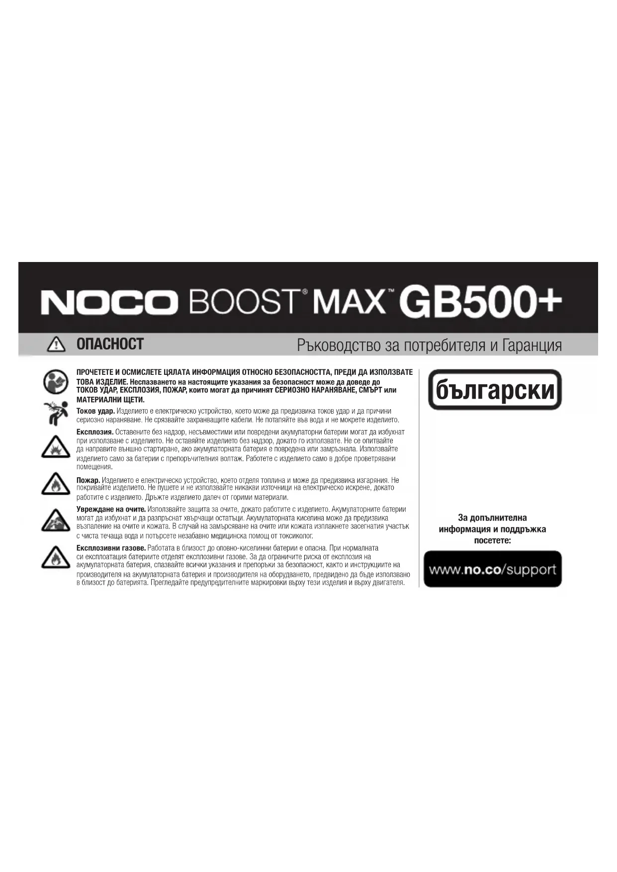 българскиЛични предпазни мерки. Използвайте изделието само по предназначение. В обсега на чуваемост на Вашия глас или в достатъчна близост трябва да има някой, който да Ви се притече на помощ в случай на спешна нужда. Осигурете в близост наличие на чиста вода и сапун в случай на замърсяване с акумулаторна киселина. Носете пълна защита за очите и защитно облекло, докато работите близо до акумулаторна батерия. След работа с акумулаторни батерии и свързаните с тях материали винаги си измивайте ръцете. При работа с акумулаторни батерии не използвайте и не носете метални предмети, включително: инструменти, часовници или накити. Ако метален предмет падне върху акумулатор, той може да отдели искри или да предизвика късо съединение и да доведе до токов удар, пожар, експлозия, които могат да предизвикат нараняване, смърт или материални щети. Непълнолетни. Ако „Купувачът“ е предвидил изделието да се използва от непълнолетно лице, закупилият го възрастен приема да осигури подробни указания и предупреждения за всички непълнолетни, преди те да го използват. Пълната отговорност при неспазване на това изискване се поема от „Купувача“, който се съгласява да обезщети NOCO за всяко непреднамерено или злонамерено използване от непълнолетно лице. Опасност от задушаване. Принадлежностите могат да представляват опасност от задушаване за деца. Не оставяйте деца без надзор с изделието или негови принадлежности. Изделието не е играчка. Работа. Работете внимателно с изделието. При удряне на изделието то може да се повреди. Не използвайте повредено изделие, включително, но не само, с пукнатини по корпуса или повредени кабели. Не използвайте изделието с повреден захранващ кабел. Влагата и течностите могат да повредят изделието. Не работете с изделието или каквито и да било електрически компоненти в близост до течности. Съхранявайте изделието и работете с него в сухи помещения. Не работете с изделието, ако е намокрено. Ако изделието вече работи и бъде намокрено, го изключете от акумулаторната батерия и прекратете незабавно употребата му. Не изключвайте изделието, като дърпате кабелите. Модификации. Не се опитвайте да променяте, модифицирате или ремонтирате никакви части на изделието. Разглобяването на изделието може да доведе до нараняване, смърт или материални щети. Ако изделието се повреди, не работи изправно или влезе в контакт с течности, прекратете употребата му и се свържете с фирма Важни предупреждения за безопасност