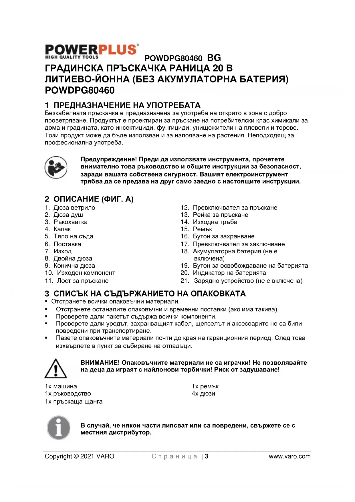 - 16 ОКОЛНА СРЕДА POWDPG80460 BG Copyright © 2021 VARO С т р а н и ц а | 3 www.varo.com ГРАДИНСКА ПРЪСКАЧКА РАНИЦА 20 В ЛИТИЕВО-ЙОННА (БЕЗ АКУМУЛАТОРНА БАТЕРИЯ) POWDPG80460 1 ПРЕДНАЗНАЧЕНИЕ НА УПОТРЕБАТА Безкабелната пръскачка е предназначена за употреба на открито в зона с добро проветряване. Продуктът е проектиран за пръскане на потребителски клас химикали за дома и градината, като инсектициди, фунгициди, унищожители на плевели и торове. Този продукт може да бъде използван и за напояване на растения. Неподходящ за професионална употреба. Предупреждение! Преди да използвате инструмента, прочетете внимателно това ръководство и общите инструкции за безопасност, заради вашата собствена сигурност. Вашият електроинструмент трябва да се предава на друг само заедно с настоящите инструкции. 2 ОПИСАНИЕ (ФИГ. A) p. 15
