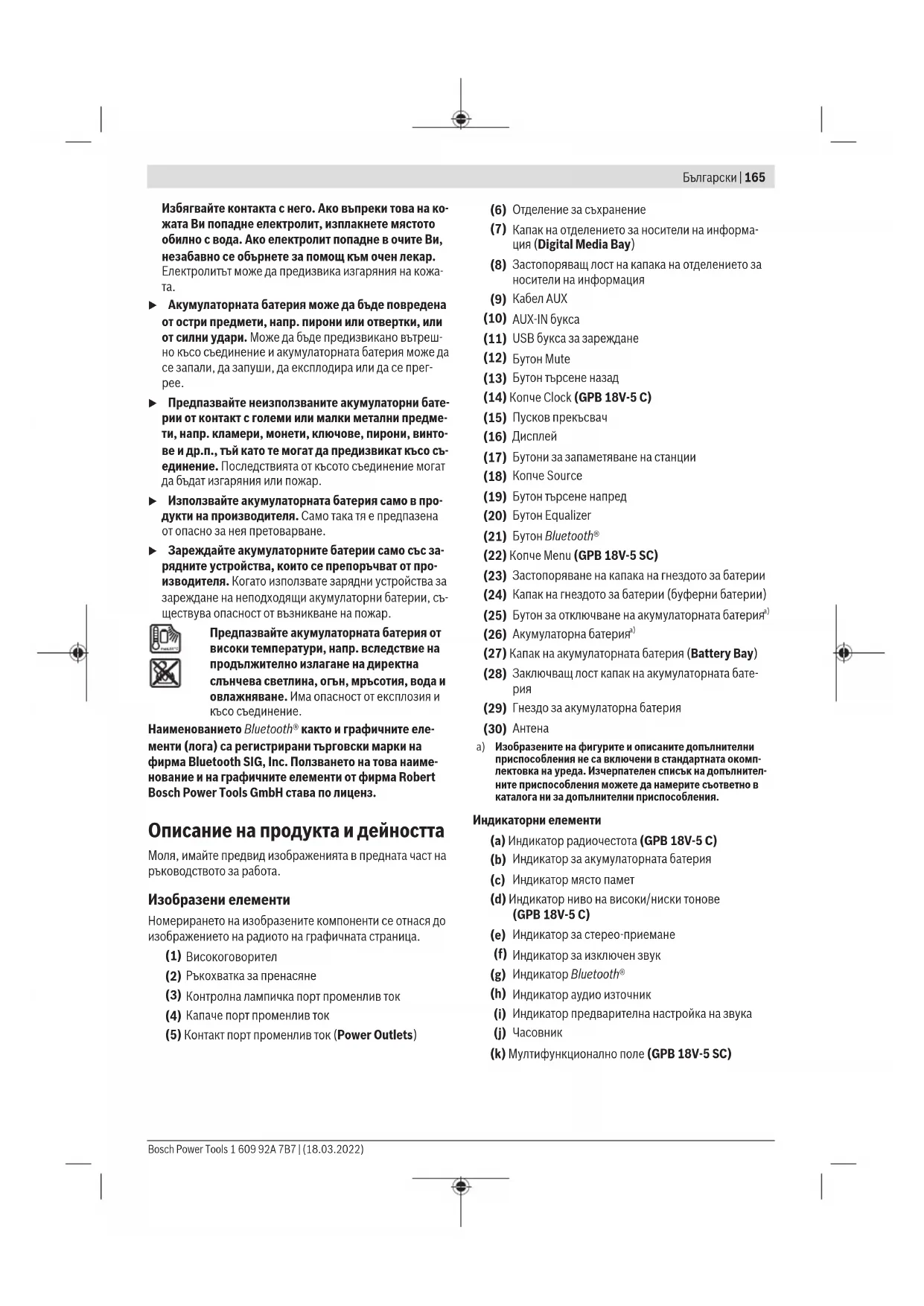 Изобразените на фигурите и описаните допълнителни приспособления не са включени в стандартната окомп- лектовка на уреда. Изчерпателен списък на допълнител- ните приспособления можете да намерите съответно в каталога ни за допълнителни приспособления. Индикаторни елементи (a) Индикатор радиочестота (GPB18V‑5C) (b) Индикатор за акумулаторната батерия (c) Индикатор място памет (d) Индикатор ниво на високи/ниски тонове (GPB18V‑5C) (e) Индикатор за стерео-приемане (f) Индикатор за изключен звук (g) Индикатор Bluetooth® (h) Индикатор аудио източник (i) Индикатор предварителна настройка на звука (j)