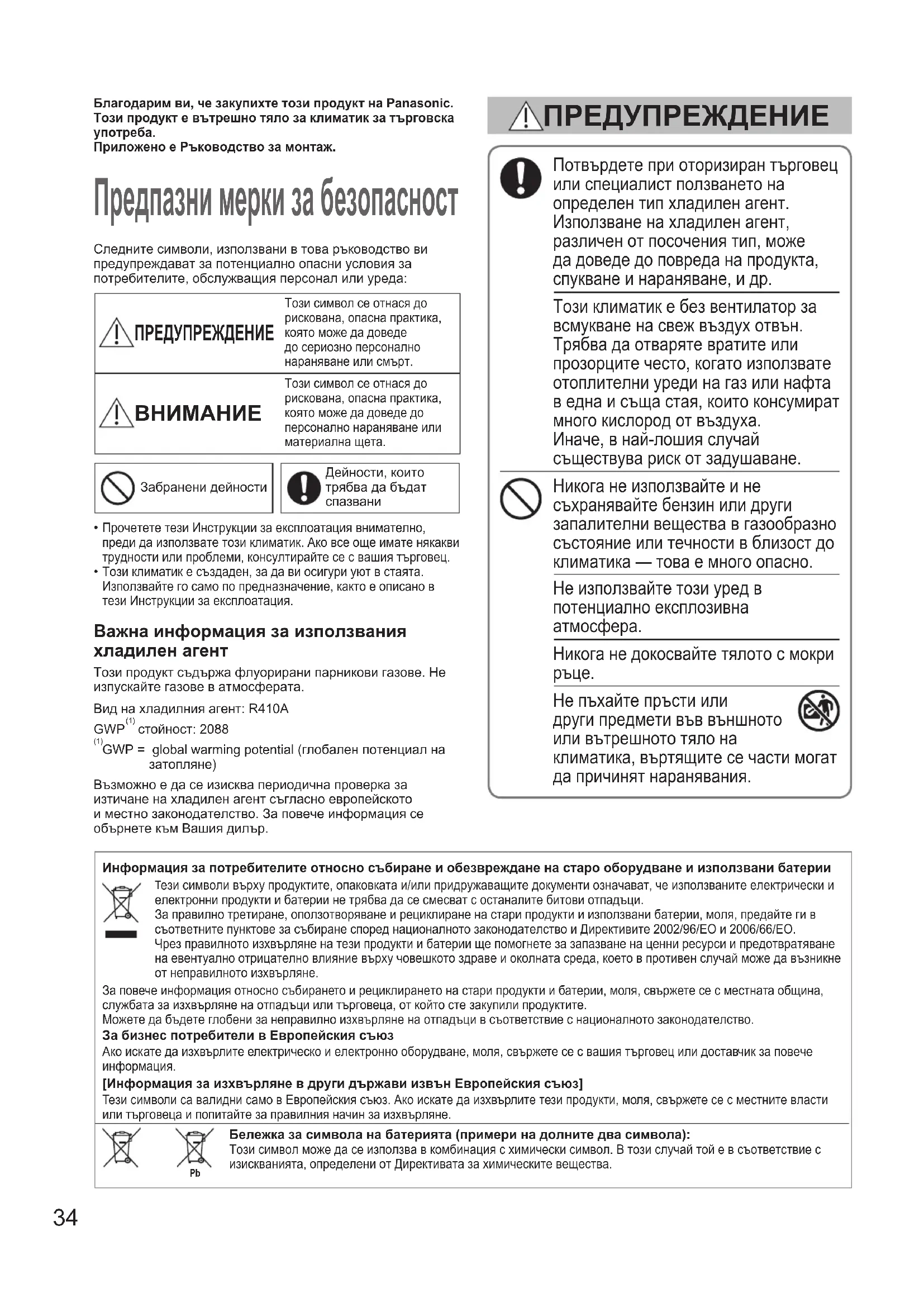 Не пъхайте пръсти или други предмети във външното или вътрешното тяло на климатика, въртящите се части могат да причинят наранявания. ПРЕДУПРЕЖДЕНИЕ Информация за потребителите относно събиране и обезвреждане на старо оборудване и използвани батерии ези символи върху продуктите, опаковката и/или придружаващите документи означават, че използваните електрически и електронни продукти и батерии не трябва да се смесват с останалите битови отпадъци.За правилно третиране, оползотворяване и рециклиране на стари продукти и използвани батерии, моля, предайте ги в съответните пунктове за събиране според националното законодателство и Директивите 2002/96/ЕО и 2006/66/ЕО.Чрез правилното изхвърляне на тези продукти и батерии ще помогнете за запазване на ценни ресурси и предотвратяване на евентуално отрицателно влияние върху човешкото здраве и околната среда, което в противен случай може да възникне от неправилното изхвърляне. За повече информация относно събирането и рециклирането на стари продукти и батерии, моля, свържете се с местната община, службата за изхвърляне на отпадъци или търговеца, от който сте закупили продуктите.Можете да бъдете глобени за неправилно изхвърляне на отпадъци в съответствие с националното законодателство.За бизнес потребители в Европейския съюз Ако искате да изхвърлите електрическо и електронно оборудване, моля, свържете се с вашия търговец или доставчик за повече информация.[Информация за изхвърляне в други държави извън Европейския съюз] Тези символи са валидни само в Европейския съюз. Ако искате да изхвърлите тези продукти, моля, свържете се с местните власти или търговеца и попитайте за правилния начин за изхвърляне.