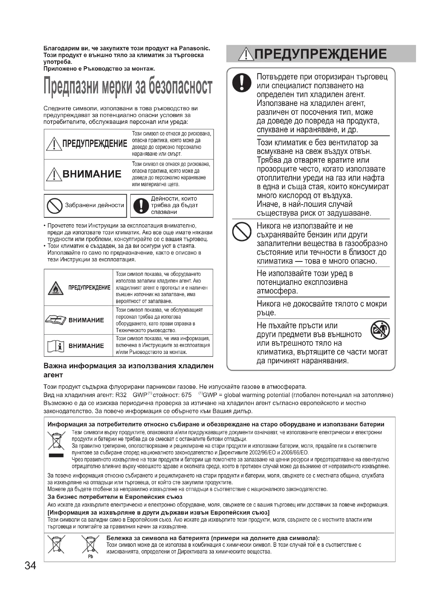 Не пъхайте пръсти или други предмети във външното или вътрешното тяло на климатика, въртящите се части могат да причинят наранявания. ПРЕДУПРЕЖДЕНИЕ ПРЕДУПРЕЖДЕНИЕ Този символ показва, че оборудването използва запалим хладилен агент. Ако хладилният агент е протекъл и е наличен външен източник на запалване, има вероятност от запалване. Този символ показва, че обслужващият персонал трябва да използва оборудването, като прави справка в Техническото ръководство.ВНИМАНИЕ Този символ показва, че има информация, включена в Инструкциите за експлоатация и/или Ръководството за монтаж. Важна информация за използвания хладилен Този продукт съдържа флуорирани парникови газове. Не изпускайте газове в атмосферата. Вид на хладилния агент: R32 GWP (1) стойност: 675 (1) GWP = global warming potential (глобален потенциал на затопляне) Възможно е да се изисква периодична проверка за изтичане на хладилен агент съгласно европейското и местно законодателство. За повече информация се обърнете към Вашия дилър. Информация за потребителите относно събиране и обезвреждане на старо оборудване и използвани батерии