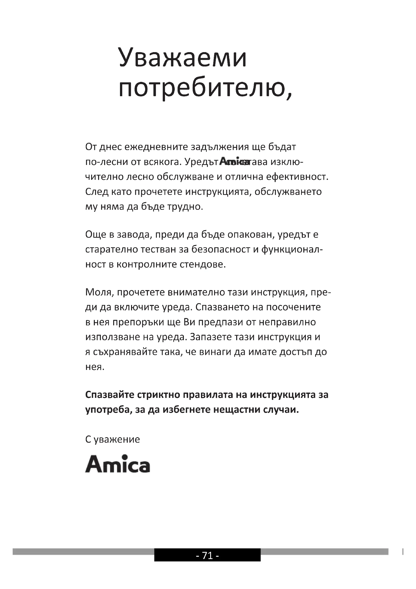 Спазвайте стриктно правилата на инструкцията за употреба, за да избегнете нещастни случаи. С уважение- 72 - ПРЕПОРЪКИ ОТНОСНО БЕЗОПАСНОСТТА