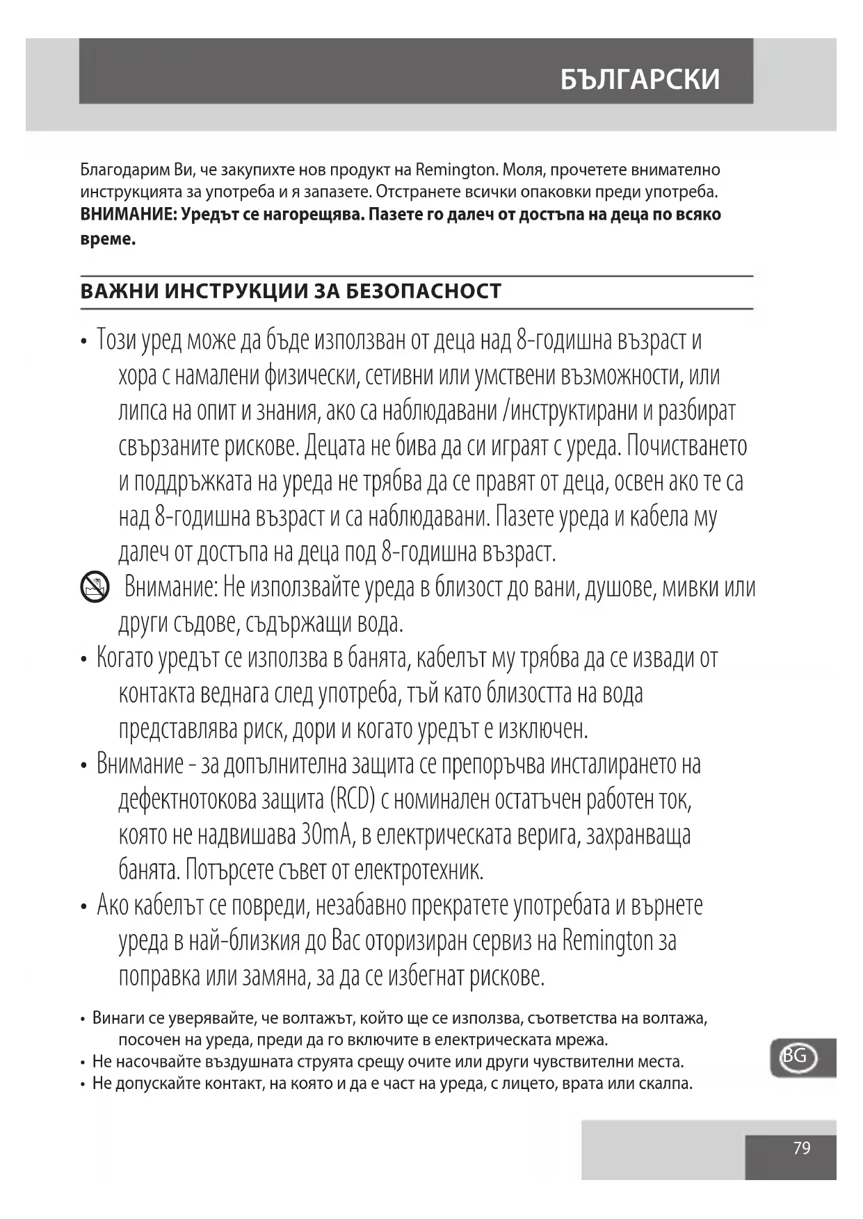 - Ако кабелът се повреди, незабавно прекратете употребата и върнете уреда в най-близкия до Вас оторизиран сервиз на Remington за поправка или замяна, за да се избегнат рискове.