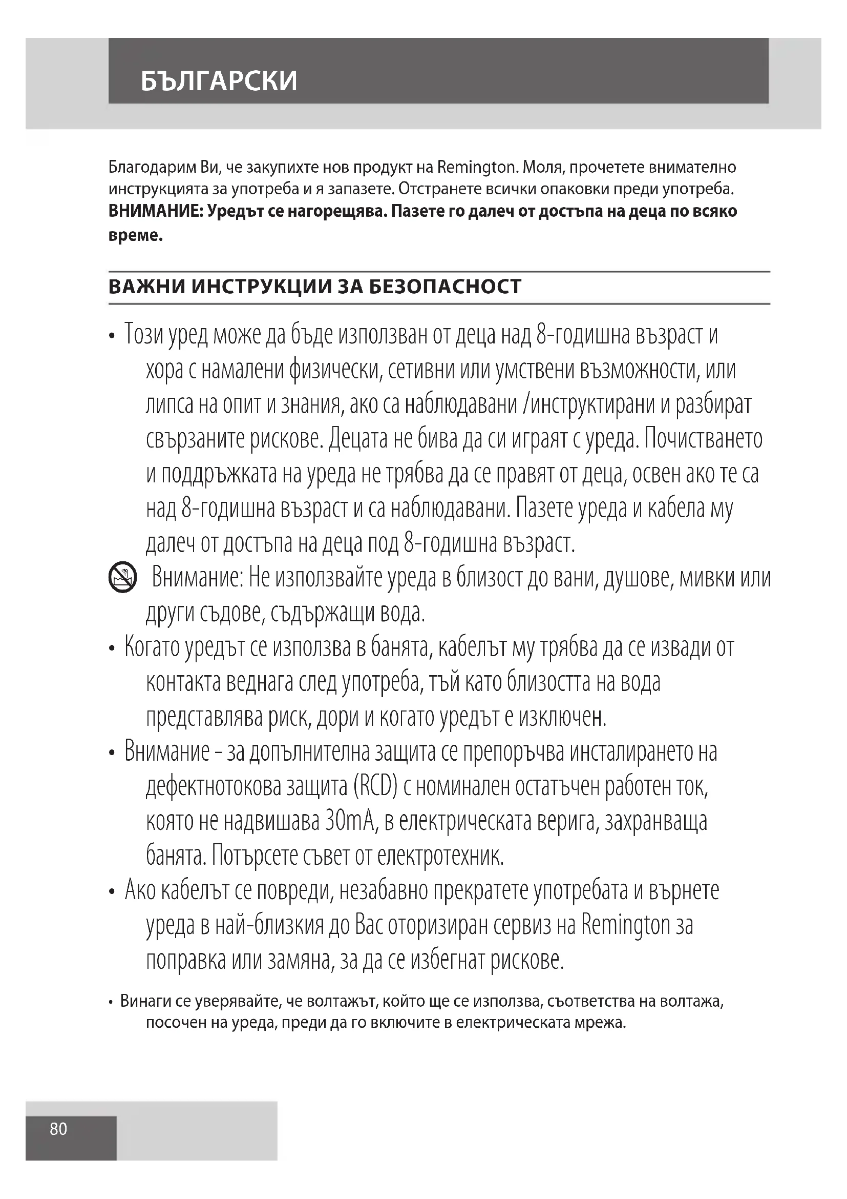 Благодарим Ви, че закупихте нов продукт на Remington. Моля, прочетете внимателно инструкцията за употреба и я запазете. Отстранете всички опаковки преди употреба. ВНИМАНИЕ: Уредът се нагорещява. Пазете го далеч от достъпа на деца по всяко