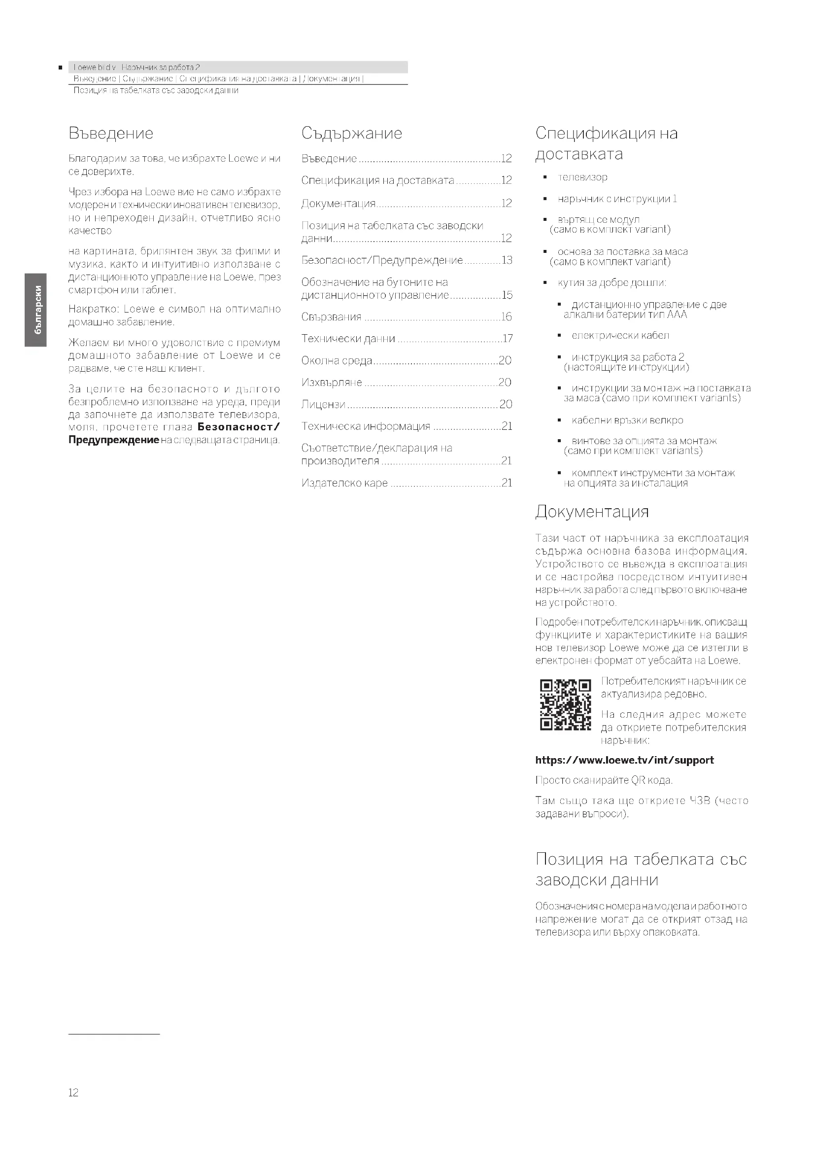 Сканирайте QR кода по-долу с телефона си и изтеглете препоръчваното приложение. “my Loewe” е входната точка към света на Loewe и ви дава достъп до всички потребителски наръчници за вашите продукти на Loewe. Conformity / Manufacturer’s declaration С настоящото Loewe Technology настоящото се декларира, че този продукт отговаря на основните изисквания и другите релевантни разпоредби на Директива 2014/53/EС и всички приложими ЕС директиви. В честотния диапазон 5150 дo 5350 Mhz този телевизор е ограничен за употреба на закрито в следните държави: Белгия, България, Дания, Германия, Естония, Финландия, Франция, Гърция, Ейре, Италия, Хърватия, Латвия, Литва, Люксембург, Малта, Нидерландия, Австрия, Полша, Португалия, Румъния, Швеция, Словакия, Словения, Испания, Чехия, Унгария, Великобритания, Кипър. Можете да откриете пълната декларация за съответствие в продуктовия избор на адрес: www.loewe.tv/int/support Издателско каре Loewe Technology GmbH Industriestraße 11 D-96317 Kronach www.loewe.tv Информацията в настоящия документ е обект на промяна без предупреждение и не представлява задължение от страна на Loewe Technology GmbH. Всички права запазени, включително превода, техническите модификации и