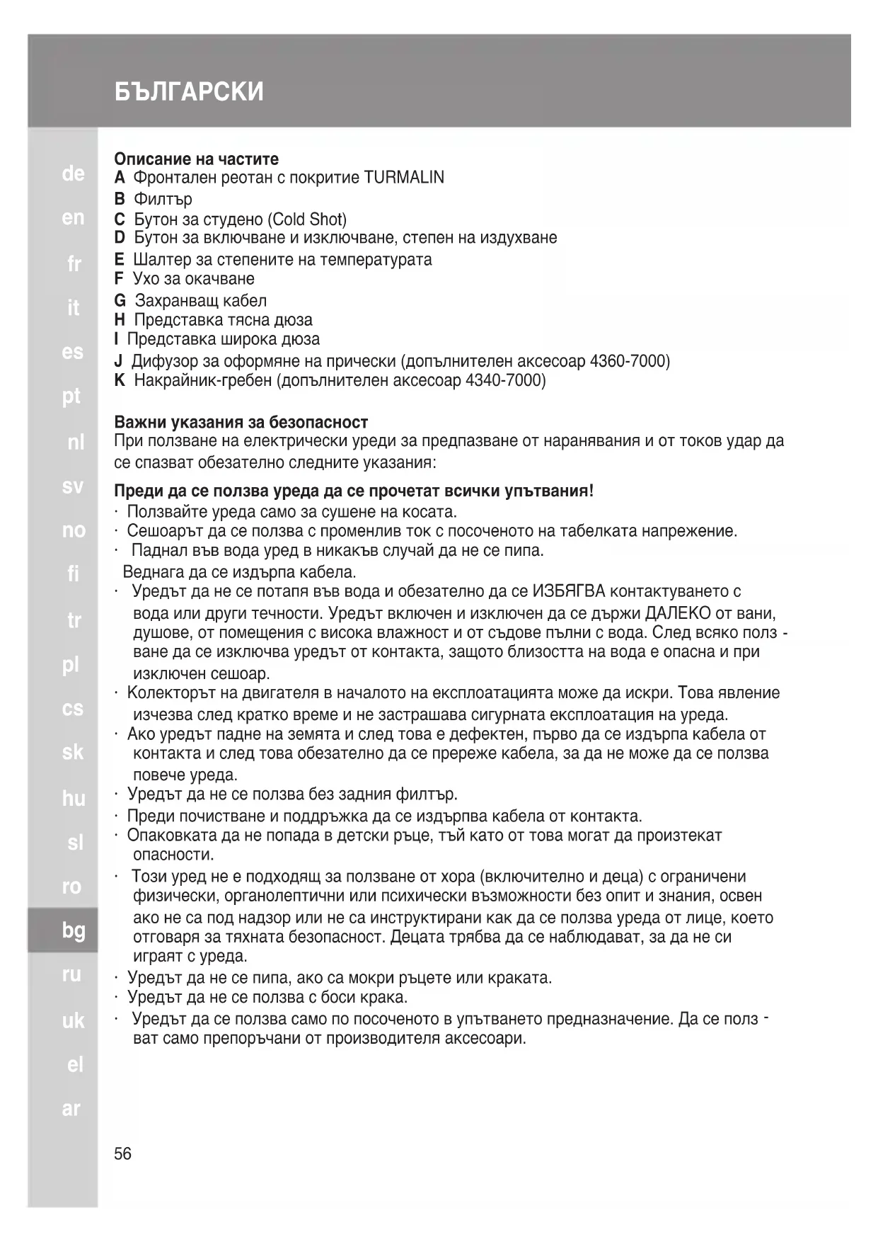 Описание на частите A Фронтален реотан с покритие TURMALIN B Филтър C Бутон за студено (Cold Shot) D Бутон за включване и изключване, степен на издухване E Шалтер за степените на температурата F Ухо за окачване G Захранващ кабел H Представка тясна дюза I Представка широка дюза J Дифузор за оформяне на прически (допълнителен аксесоар 4360-7000) K Накрайник-гребен (допълнителен аксесоар 4340-7000) Важни указания за безопасност При ползване на електрически уреди за предпазване от наранявания и от токов удар да се спазват обезателно следните указания: Преди да се ползва уреда да се прочетат всички упътвания!